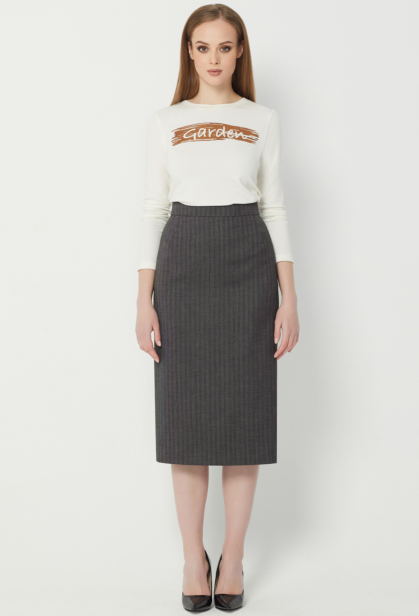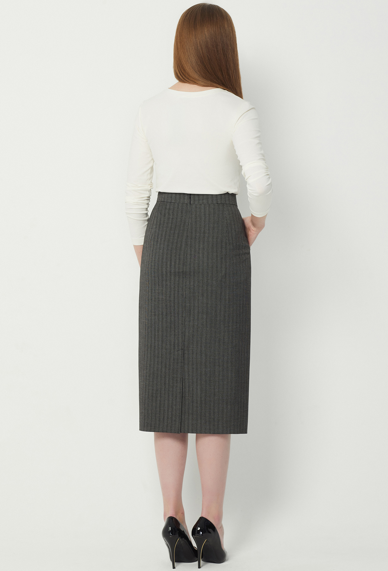 Юбка-миди на притачном поясе. Передняя половинка с косыми карманами. В среднем шве задней половинки обработаны потайная молния и шлица. На подкладке.