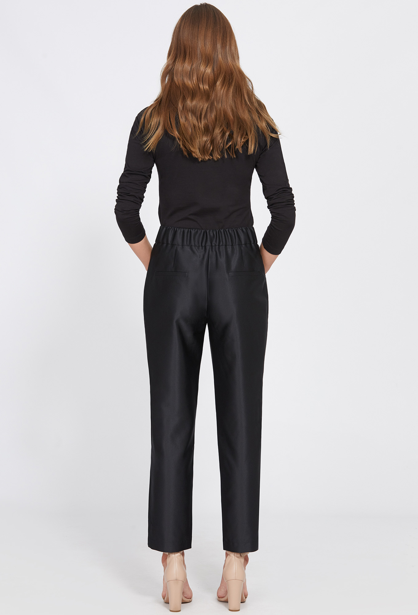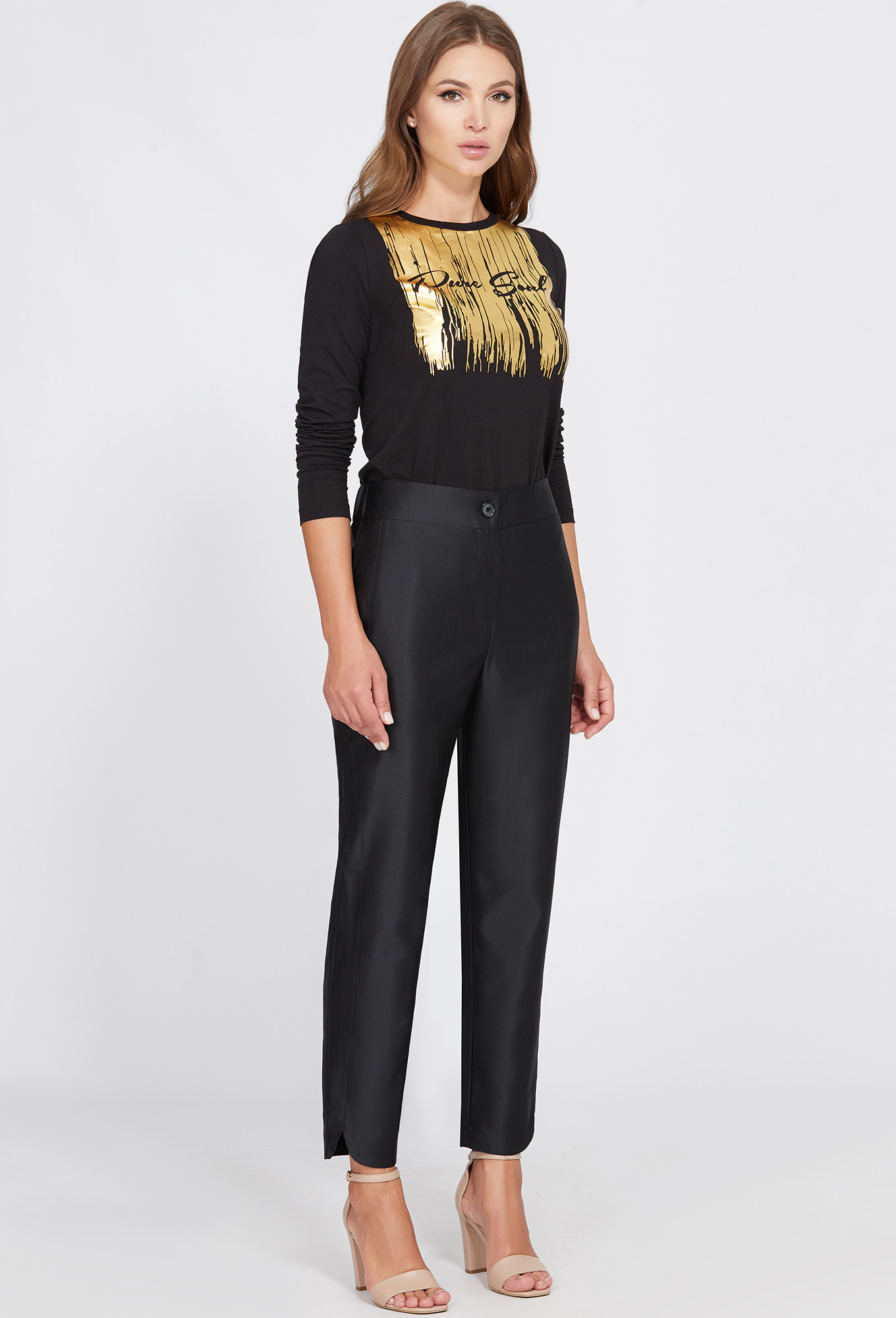 Стильные однотонные брюки на притачном поясе, частично присборенном на резинку, с застёжкой на молнию и петлю-пуговицу. Передние части с отрезными деталями и фигурным ассиметричным низом. Задние части с карманами-обманками с листочками.