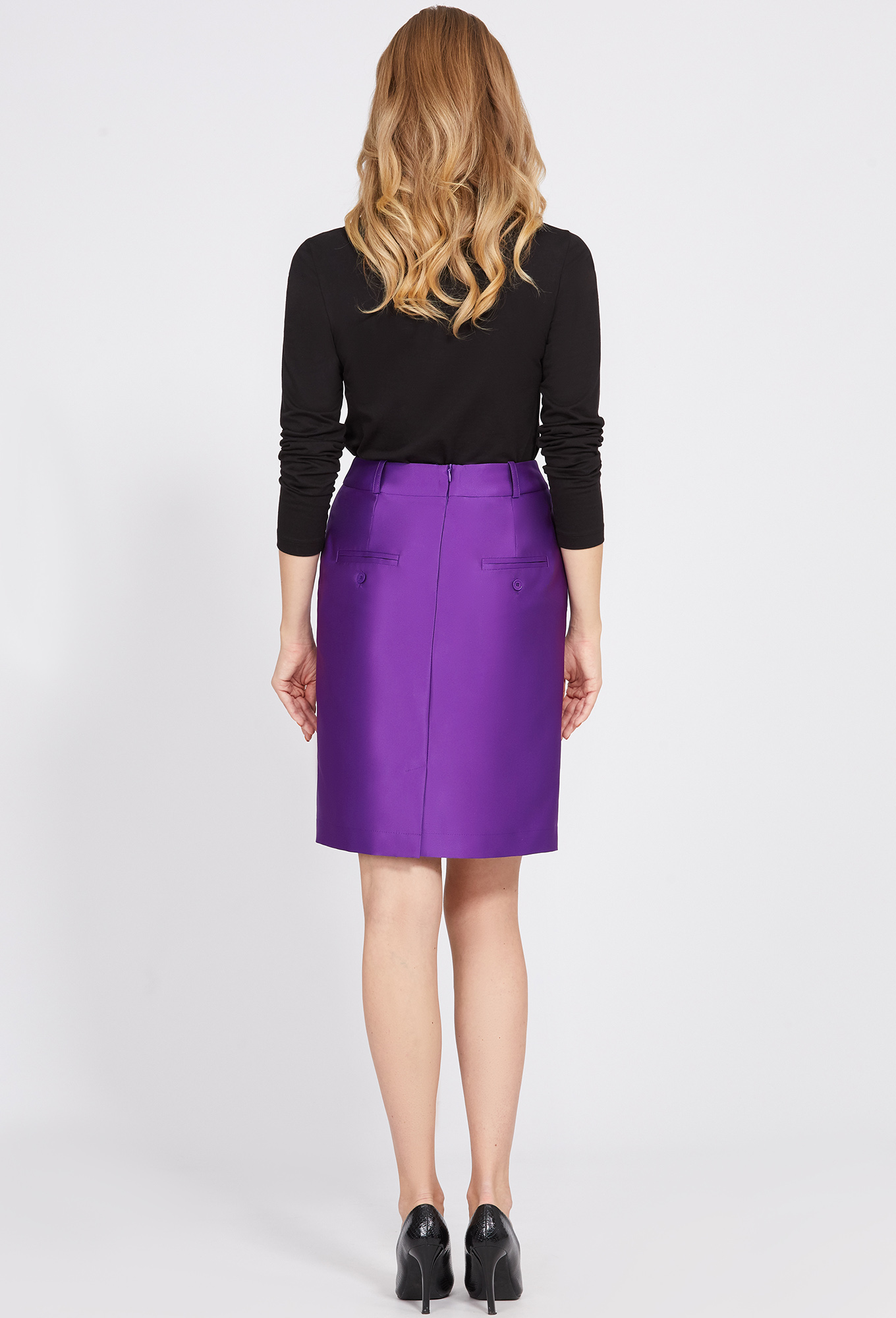 У юбки передняя половина с косыми карманами, в среднем шве задней половины юбки обработаны потайная молния и шлица. На подкладке.