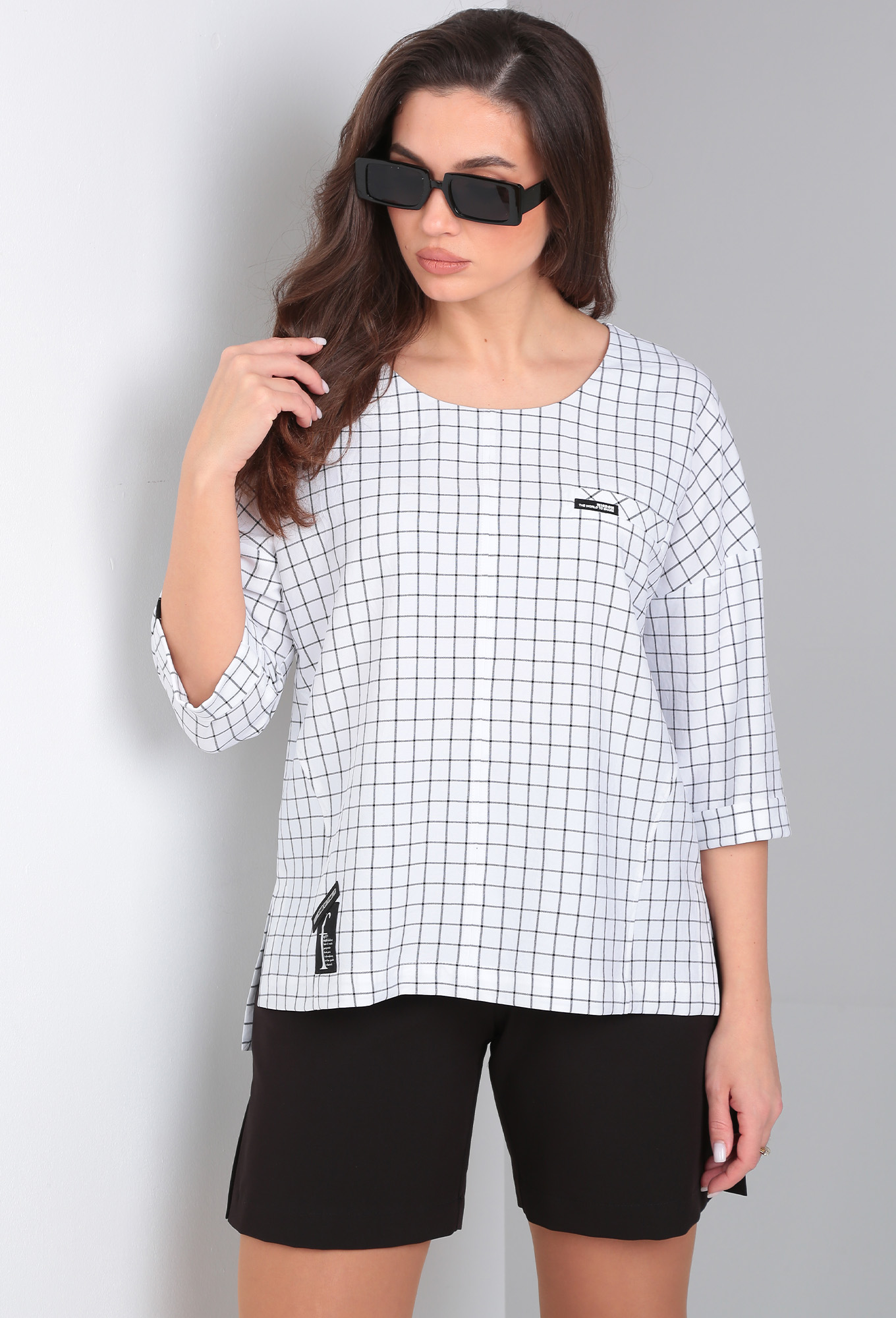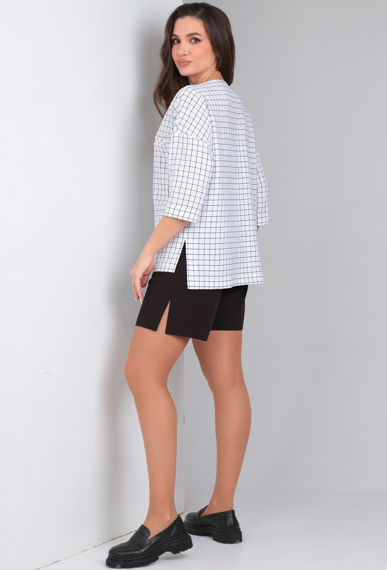 Модель: СВТ 581 молочно-черный Ро..показатьст: 164 см (рост модели на фото 170см) Сезон: Весна-Лето Тип ткани: лен 85%, пэ 10%, ликра 5%Летний костюм состоит из брюк и шорт.