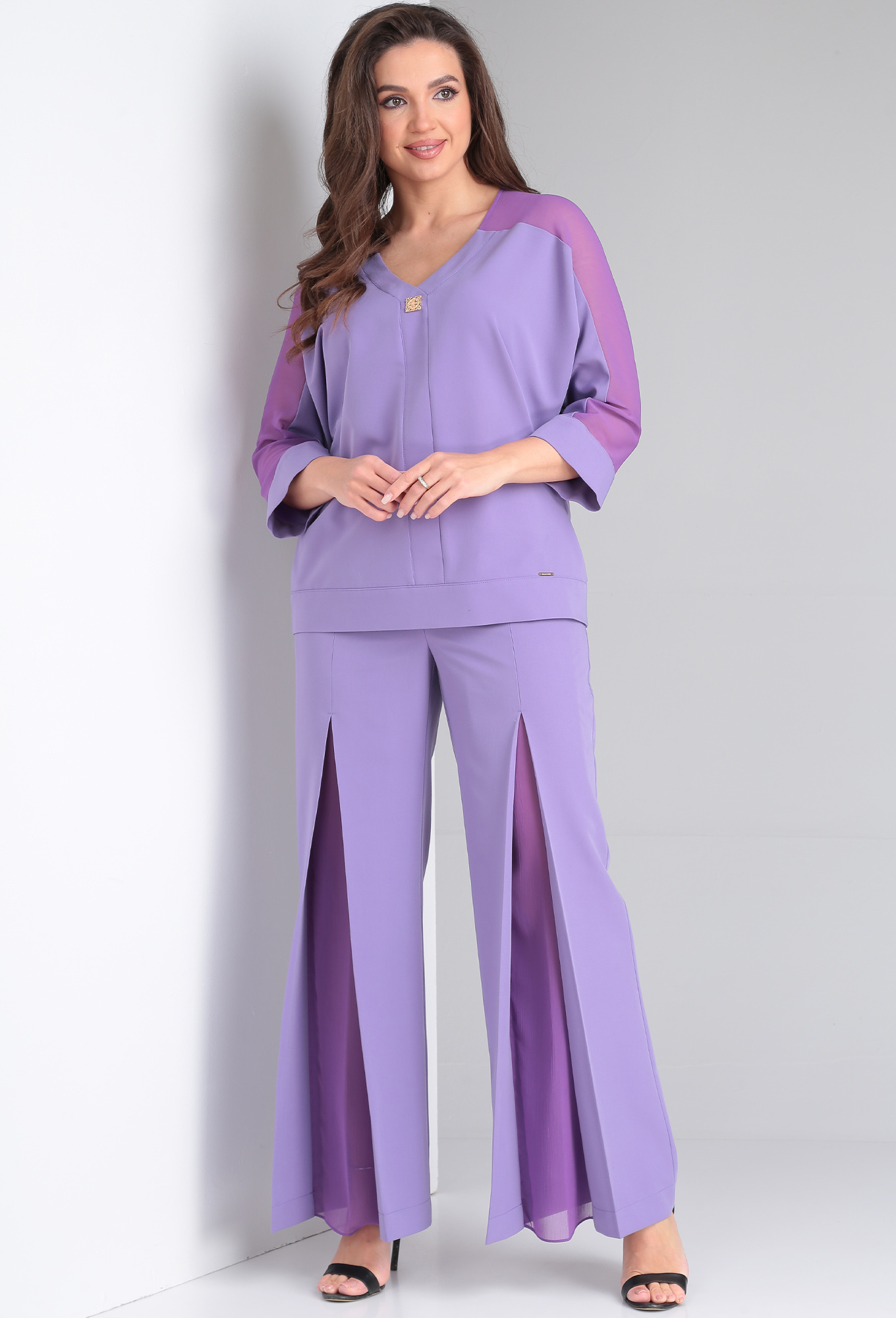 Модель: СВТ 582 фиолетовый Рост: ..показать164 см (рост модели на фото 170см) Сезон: Весна-Лето Тип ткани: Полиэстер 55%, вискоза 40%, эластан 5%Костюм состоит из блузы и брюк. Блуза летучая мышь. Манжет на пуговках 5.5 см. По спинке кокетка 14см, на груди клапаны 9 см. Длина изделия 62см. Длина рукава 51см. Брюки:_x000D_