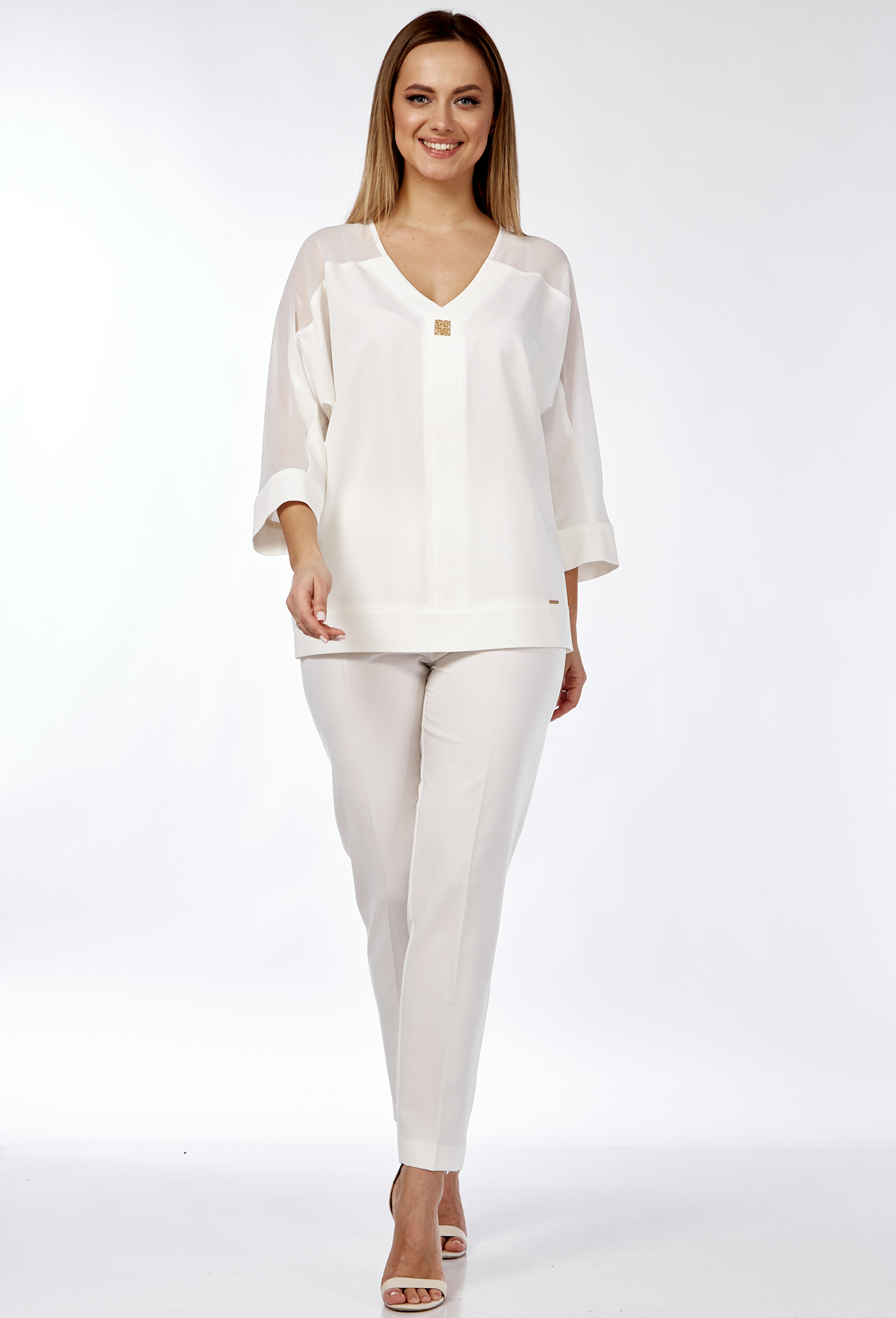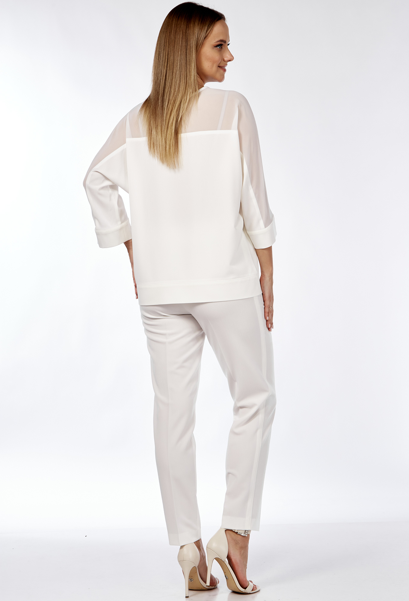 Модель: СВТ 596 молочный Рост: 16..показать4 см (рост модели на фото 170см) Сезон: Весна-Лето Тип ткани: Полиэстер 55%, вискоза 40%, эластан 5%Легкий летний брючный костюм состоящий из блузы с шифоновыми вставками и брюк._x000D_