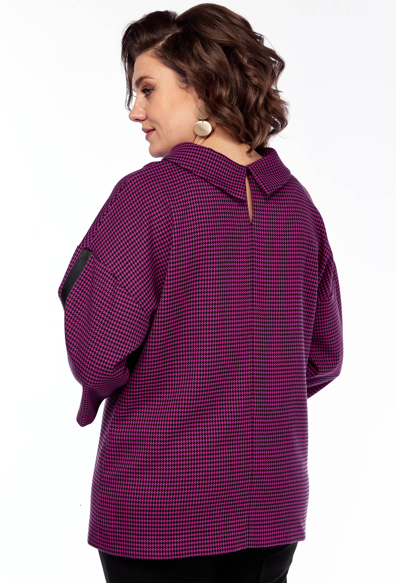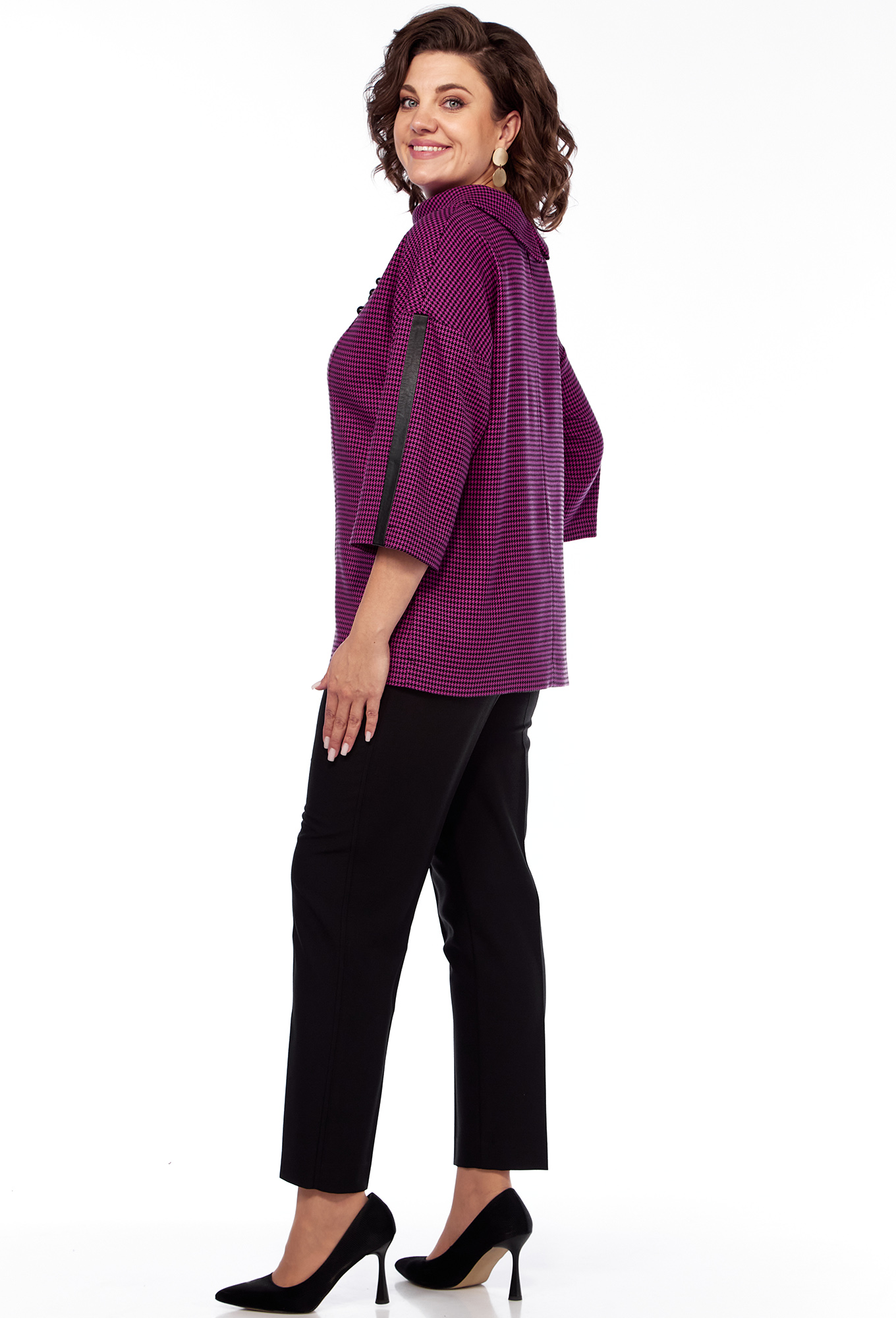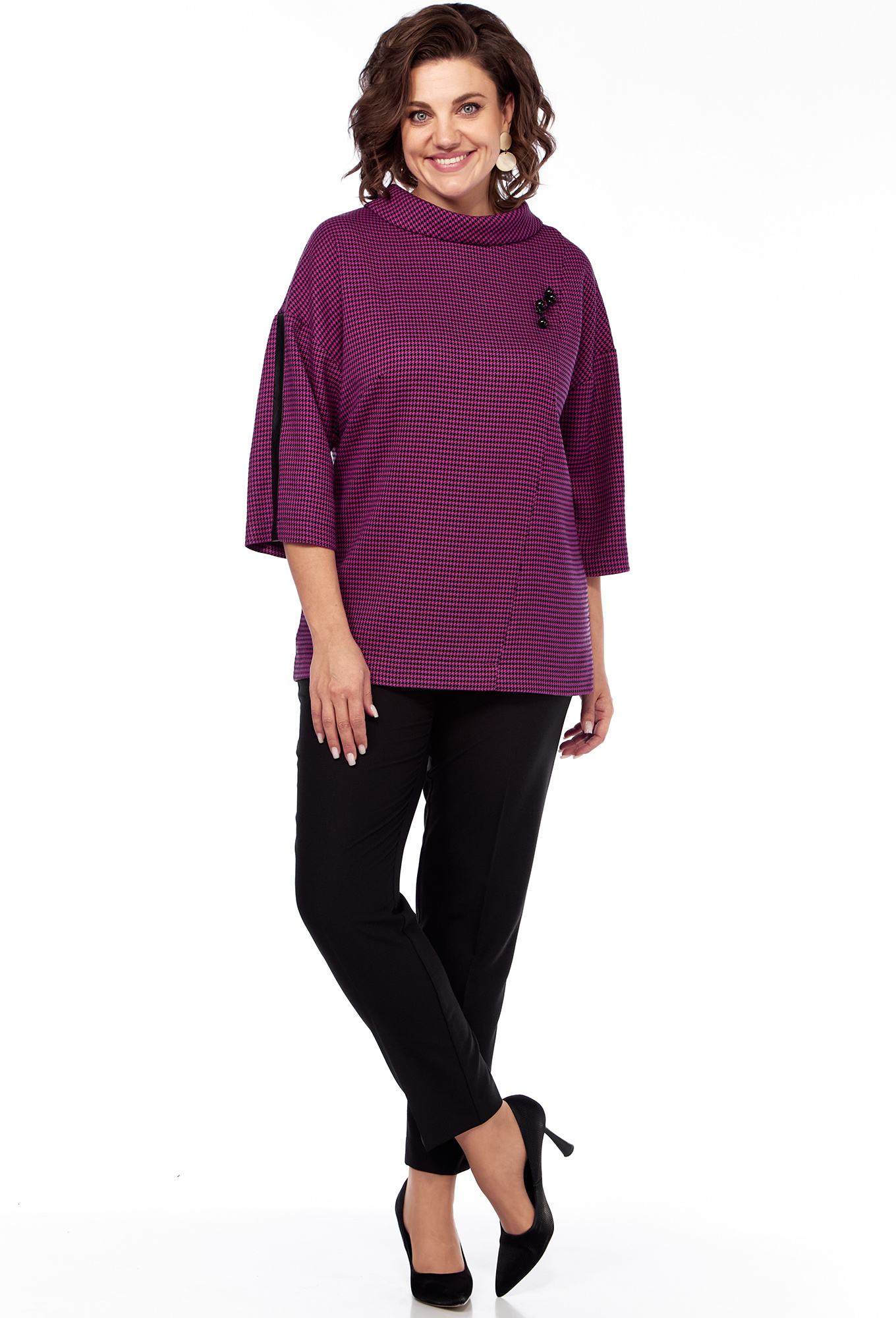 Модель: СВТ 609 фуксия Рост: 164 ..показатьсм (рост модели на фото 170см) Сезон: Осень-Зима Тип ткани: Полиэстер 55%, вискоза 40%, эластан 5%Комплект Блузка и брюки. Блузка: длина 65 см, длина рукава ¾ 42 см (летучая мышь). Отделка кожа. Застежка на пуговку по спинке.