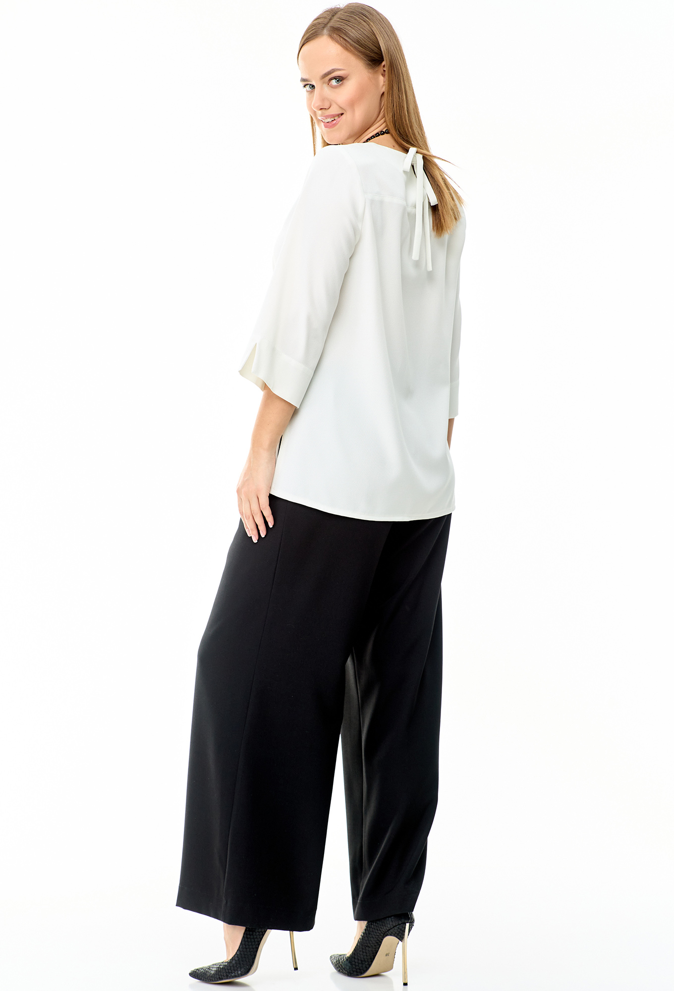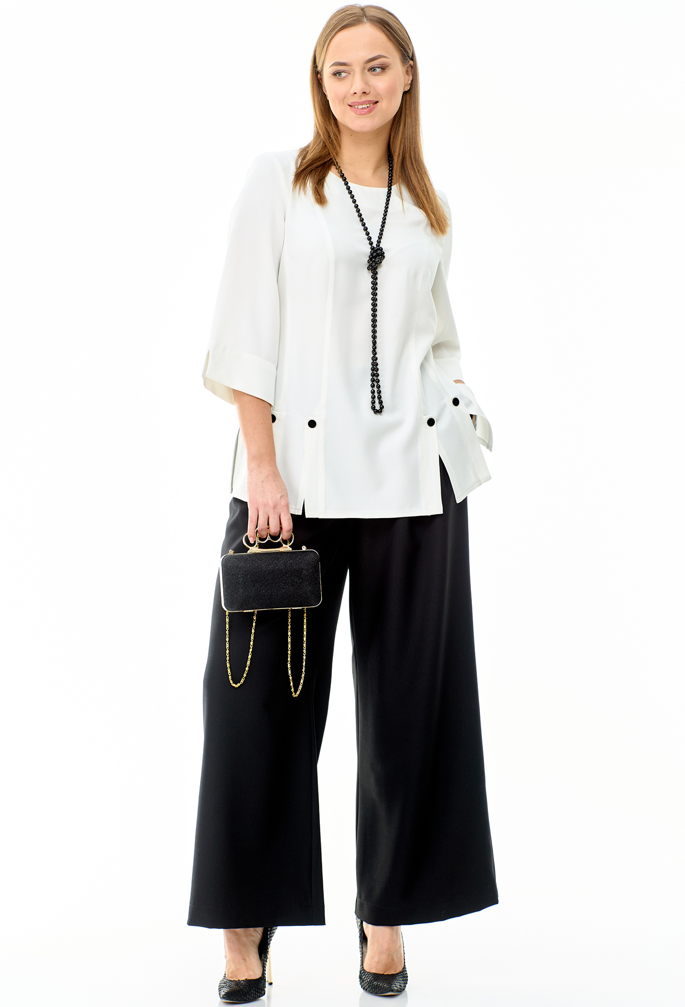 Модель: Таита Плюс 2304 бело-чёрный <..показатьli>Рост: 164 см (рост модели на фото 172см) Сезон: Круглогодичный Тип ткани: Блуза — 72% хлопок, 26% вискоза, 2% эластанБрюки — 88% полиэстер, 12% спандексСтильный, красивый женский комплект, состоит из брюк палаццо и блузона из хлопка хорошего качества. Интересный крой блузона с двумя вертикальными линиями по переду, переходящими в разрезы с планкой и декоративными пуговичками. Рукав втачной, длина 45 см. Спинка прямая, с кокеткой и бантом сзади. Длина блузона 71 см. Брюки палаццо с 4 защипами по переду и функциональными карманами. Пояс сзади на резинке, длина брюк — 103 см. Бусы в комплект не входят.li>Рост: 164 см (рост модели на фото 172см) Сезон: Круглогодичный Тип ткани: Блуза — 72% хлопок, 26% вискоза, 2% эластанБрюки — 88% полиэстер, 12% спандекс