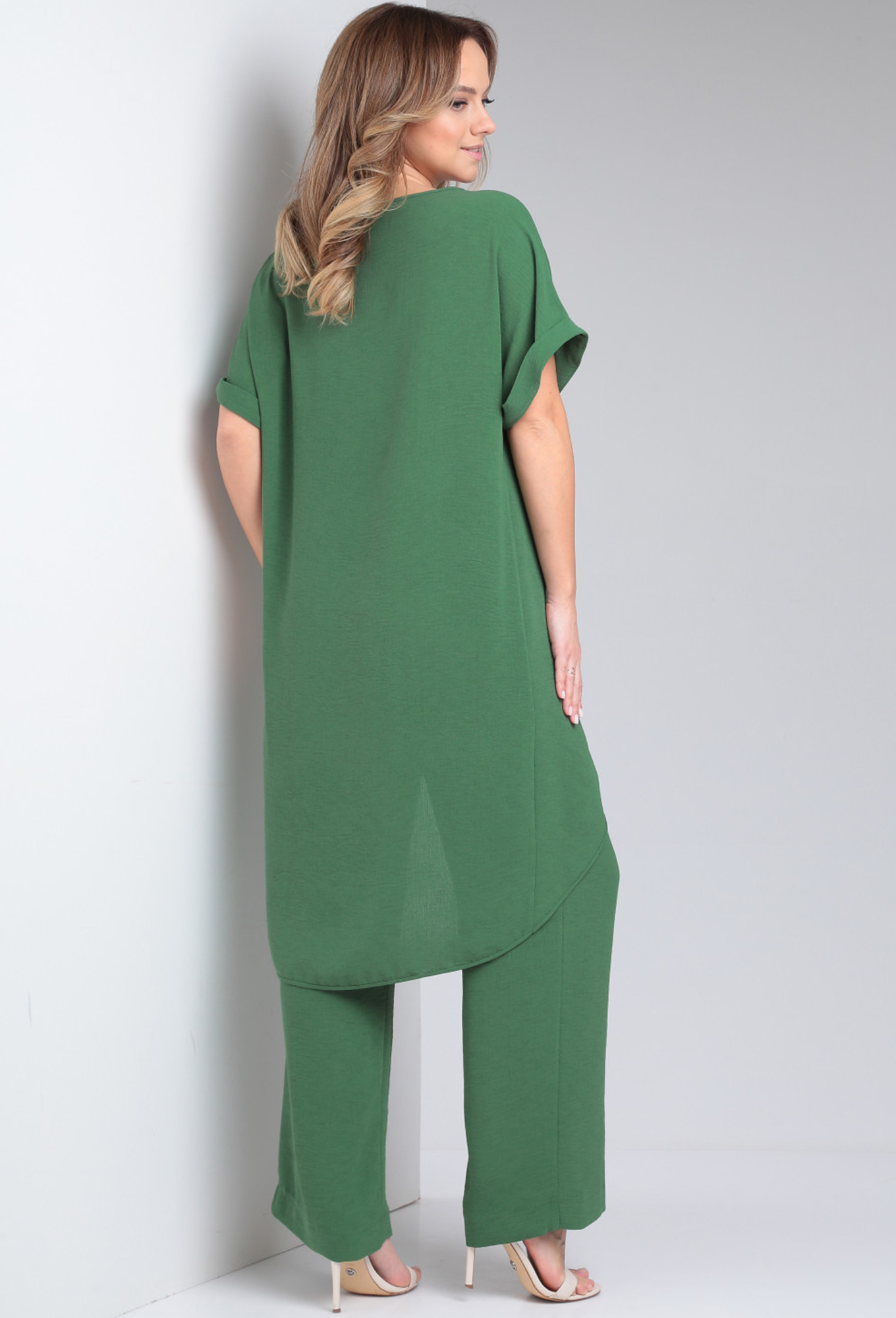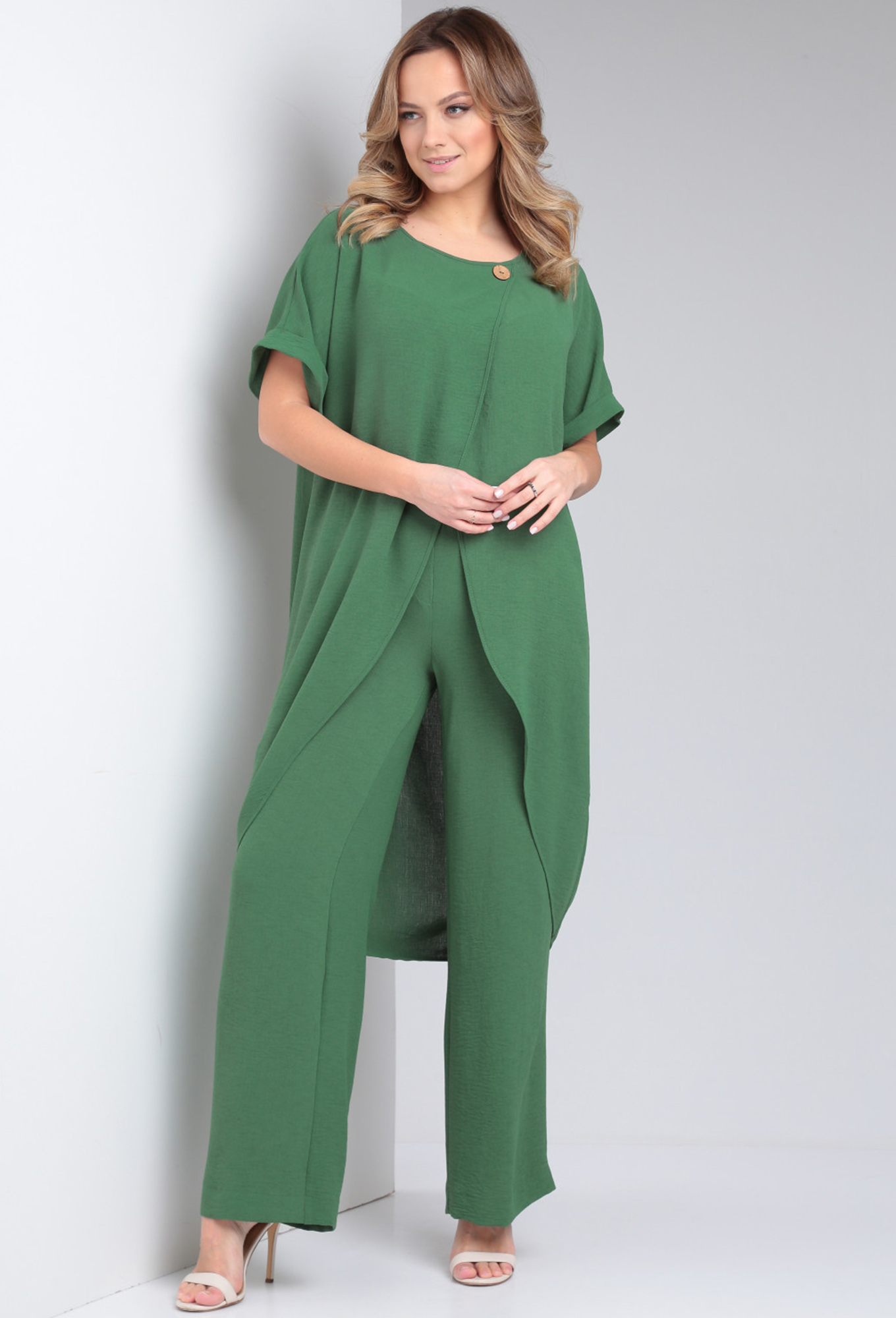Модель: Твин 7686 зелёный Рост: 1..показать64 см (девушка на фото ростом 170см) Сезон: Весна-Лето Тип ткани: Полиэстер 63%, вискоза 33%, спандекс 4%Комплект женский двойка, состоящий из туники и брюк. Изделие свободного покроя из плательно-костюмной ткани с вискозой. Туника по переду из двух деталей на запах. Спинка цельная. Низ изделия фигурный, спинка длиннее. Горловина и низ окантованы. Линия плеча спущена, рукав цельнокроенный на манжете. Брюки свободные прямые к низу, с поясом на резинке. В боковых швах функциональные карманы.