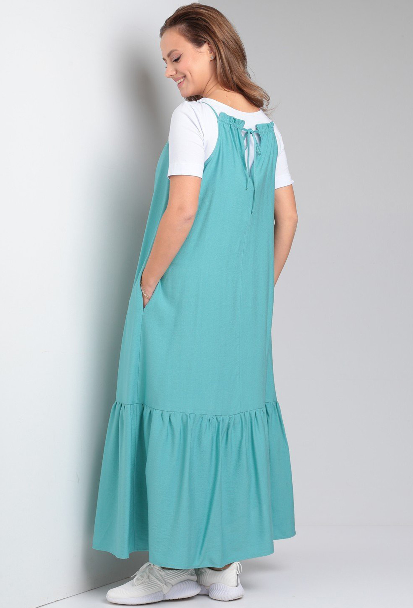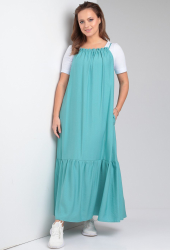 Модель: Твин 7802 бирюзовый Рост:..показать 164 см (девушка на фото ростом 170см) Сезон: Весна-Лето Тип ткани: Сарафан- вискоза 87%, нейлон 13%Майка- вискоза 100%Комплект женский двойка, состоит из сарафана и майки. Сарафан свободного покроя из однотонно-плательной ткани. Легкость, свободу и комфорт - именно эти ощущения вам доставит данная модель. Горловина переда и спинки на кулисе, присобрана шнуром из основной ткани. Спинка со средним швом. В боковых швах функциональные карманы. _x000D_