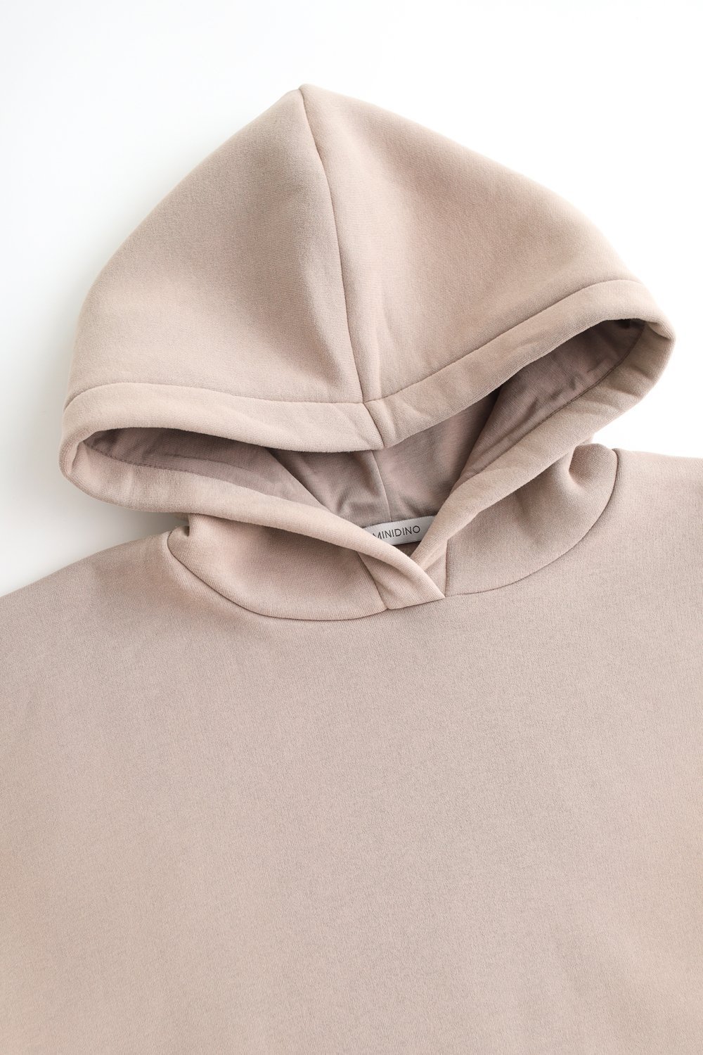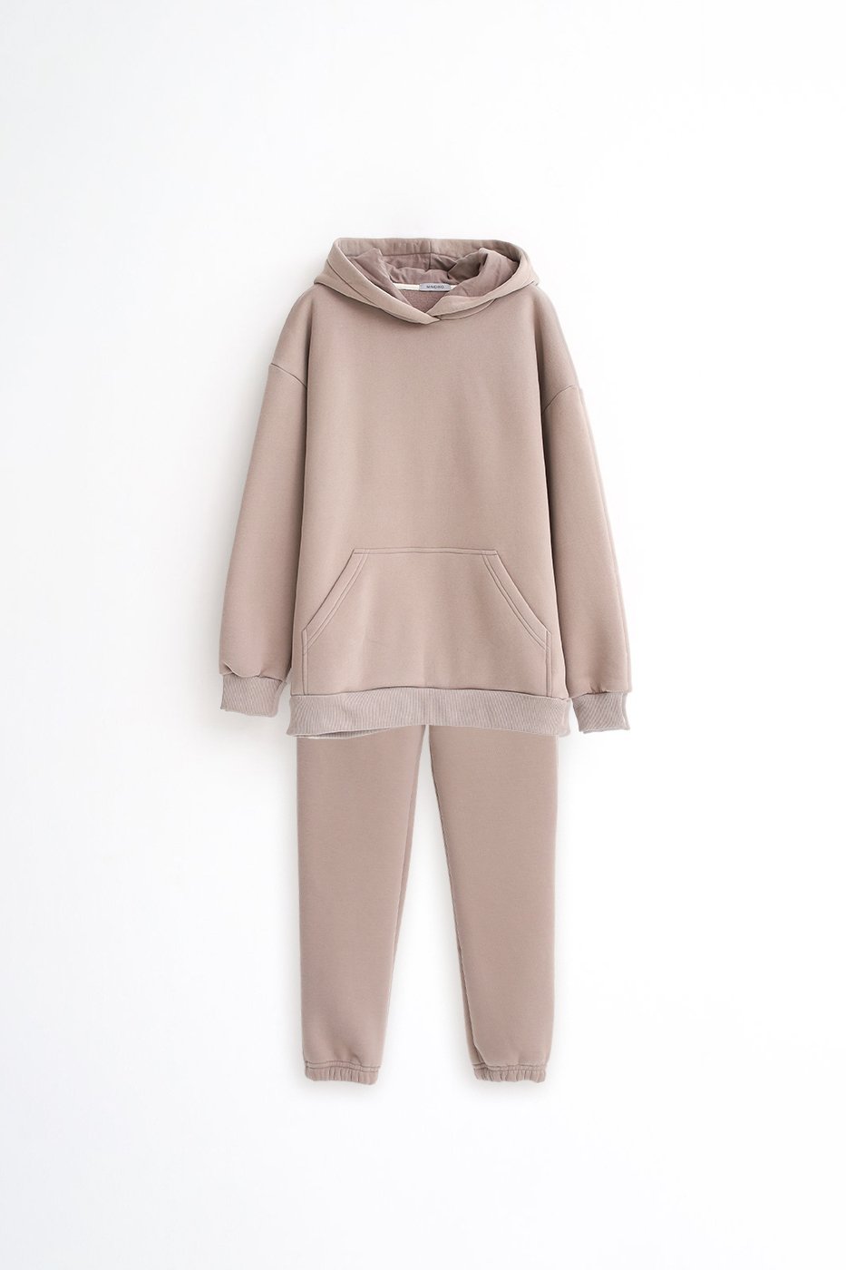 Комплект свободного кроя. Худи свободного силуэта, с карманом кенгуру по центру полочки, с капюшоном Брюки с мягким поясом на резинке со шнуром, на правой задней половинке обработан прямоугольный накладной карман со скругленными углами.