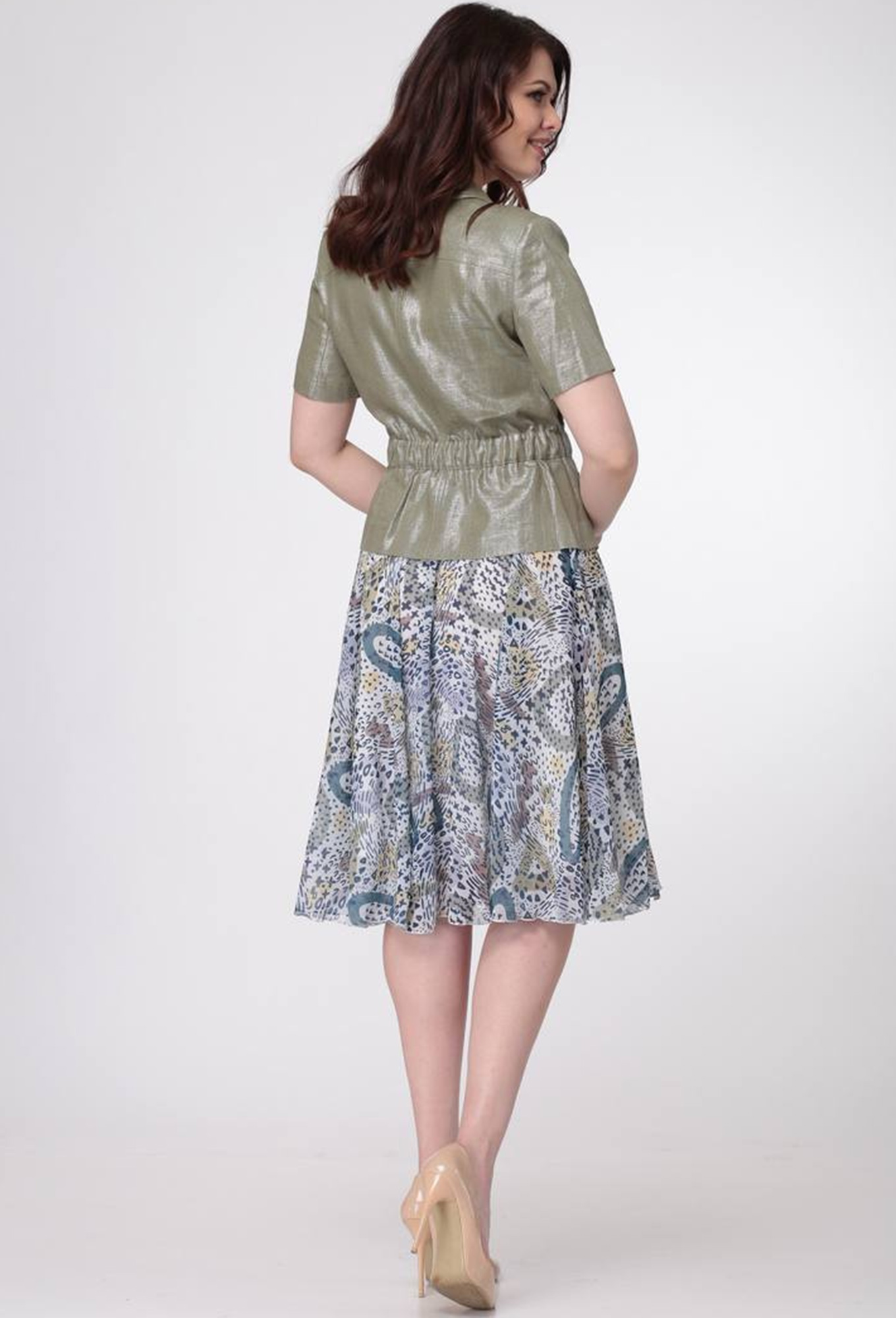 Модель: Верита 1174 хаки синий Ро..показатьст: 164 см (девушка на фото ростом 170см) Сезон: Весна-Лето Тип ткани: Жакет- 35% Хлопок, 65% полиэстер Юбка- 100% полиэстерЖакет полуприлегающего силуэта без подкладки с плечевыми вставками. Воротник с лацканами, рукав короткий втачной. По переду декоративный клапан. Жакет под пояс с кулисками. По спинке кокетка. Застежка на петли пуговицы. Юбка солнце на резинке, с подкладкой.