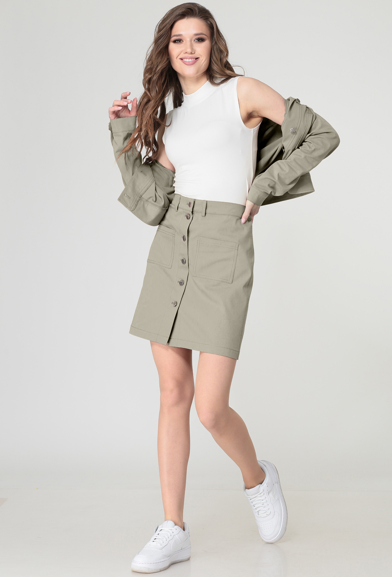 Модель: Верита 2298-2098 хаки Рос..показатьт: 164 см (девушка на фото ростом 170см) Сезон: Весна-Лето Тип ткани: Куртка и юбка - хлопок 71%, полиэстер 26%, эластан 3%Топ - вискоза 100%Весенний джинсовый комплект состоящий из куртки, топа и юбки._x000D_