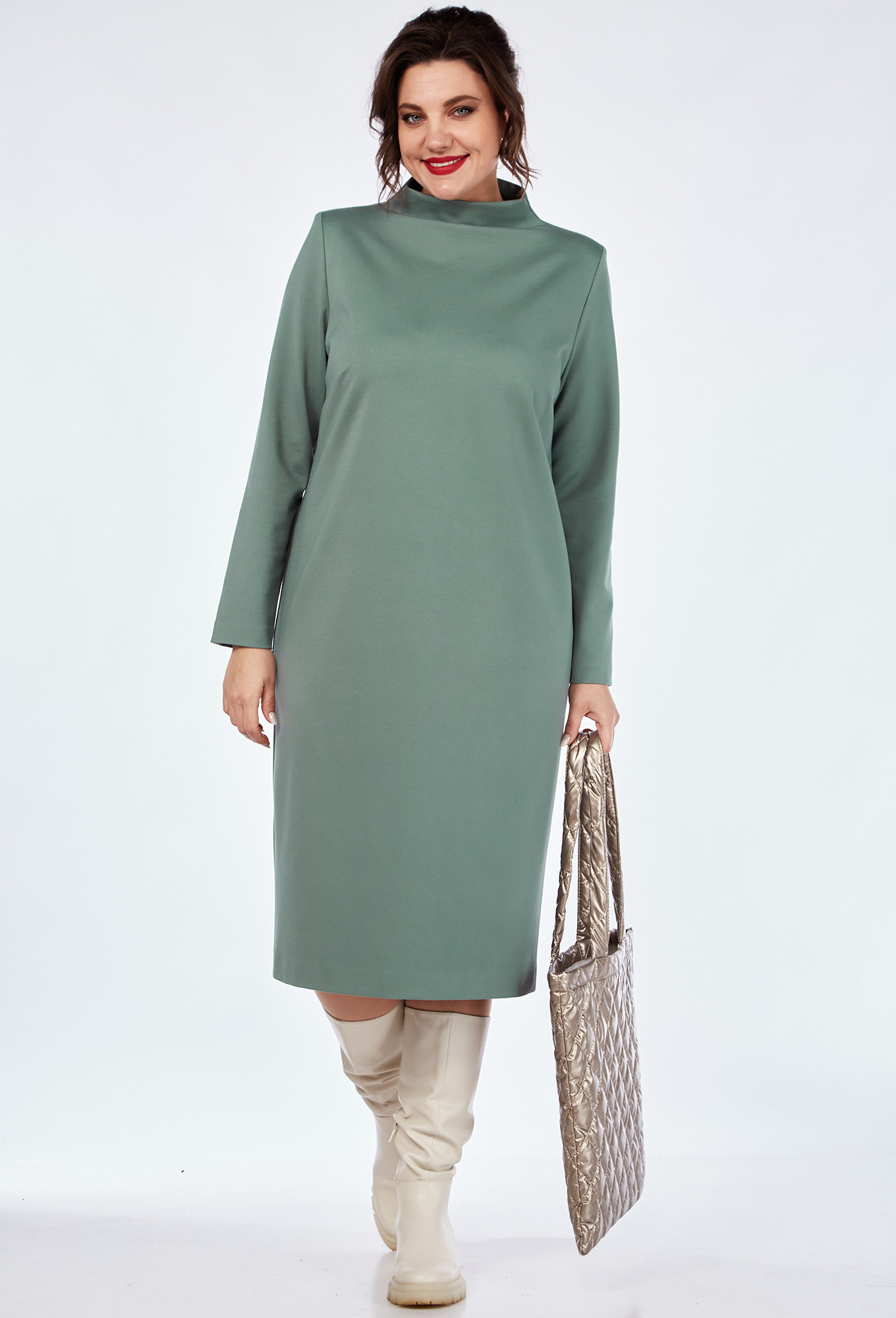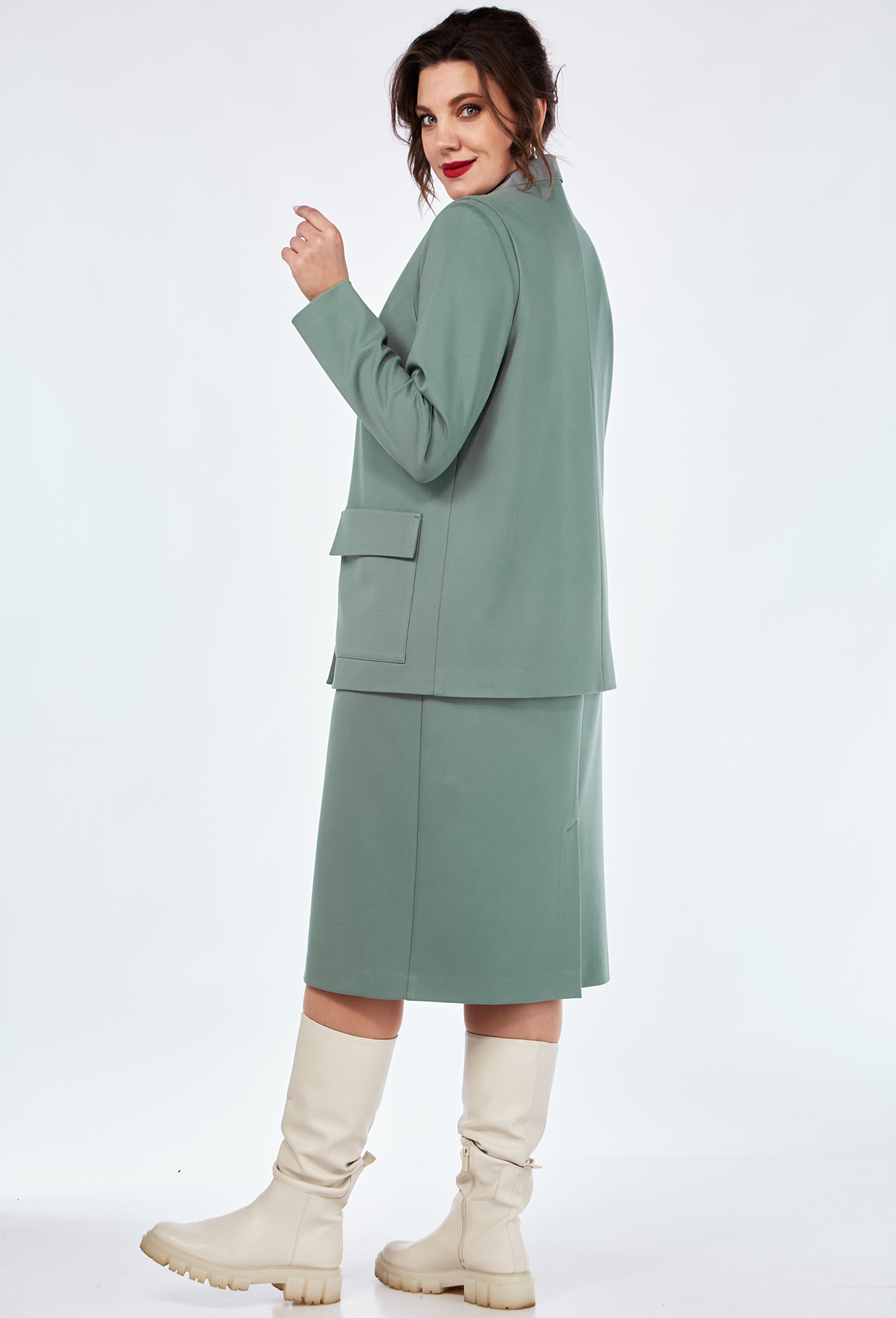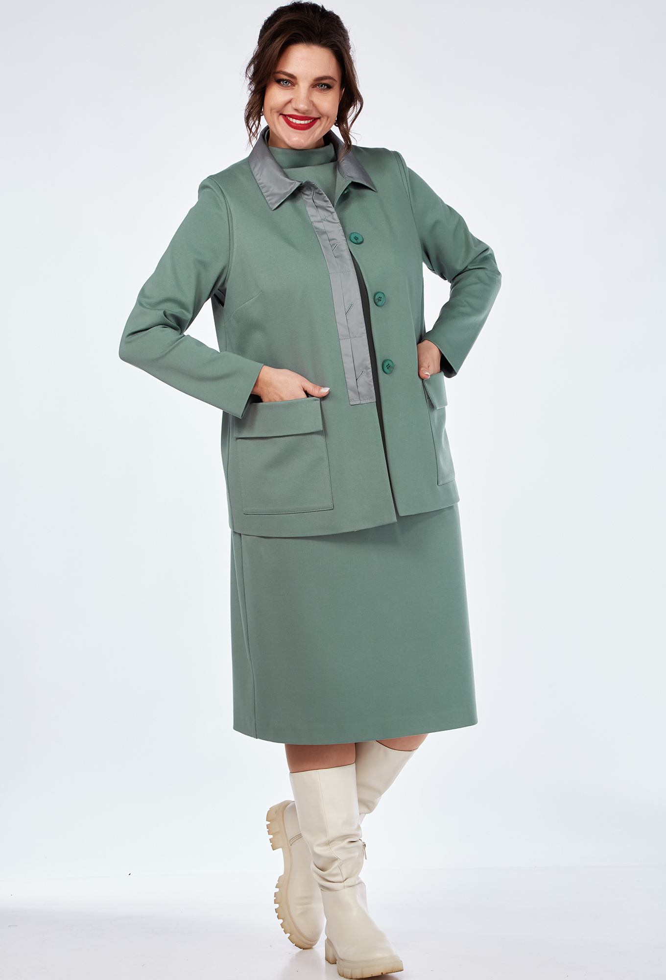 Модель: ВИЛЕНА 936 мята Рост: 164..показать см (девушка на фото ростом 170см) Сезон: Осень-Зима Тип ткани: Вискоза 70%, ПА 25%, спандекс 5%Костюм женский двухпредметный, состоящий из платья и жилета из трикотажного полотна с отделкой из плащёвки. Жилет женский полуприлегающего силуэта длиной до бёдер с центральной декоративной застёжкой с подрезом на 4 петли-пуговицы. По переду обработаны нагрудные вытачки, идущие из бокового шва и накладные карманы, имитирующие клапан. Спинка со средним швом. Воротник отложной. Жилет на подкладке. Платье женское, слегка зауженное к низу, полуприлегающего силуэта, длиной до колена с цельнокроеным воротником-стойкой. По деталям переда обработаны нагрудные вытачки. Спинка со средним швом, заканчивающимся шлицей. Рукава втачные, длинные, одношовные.