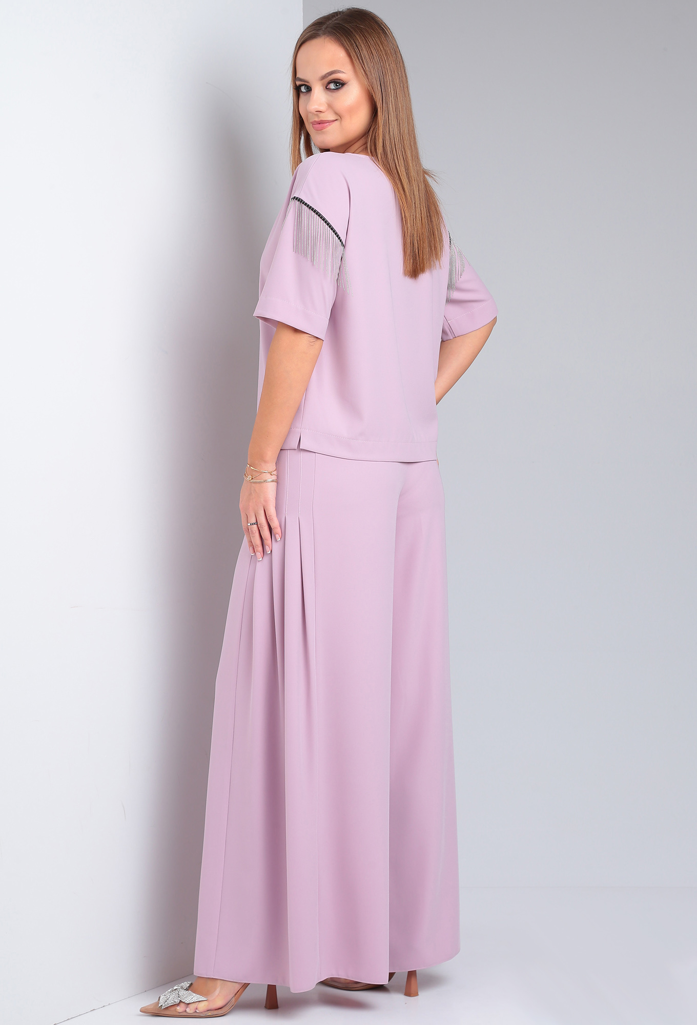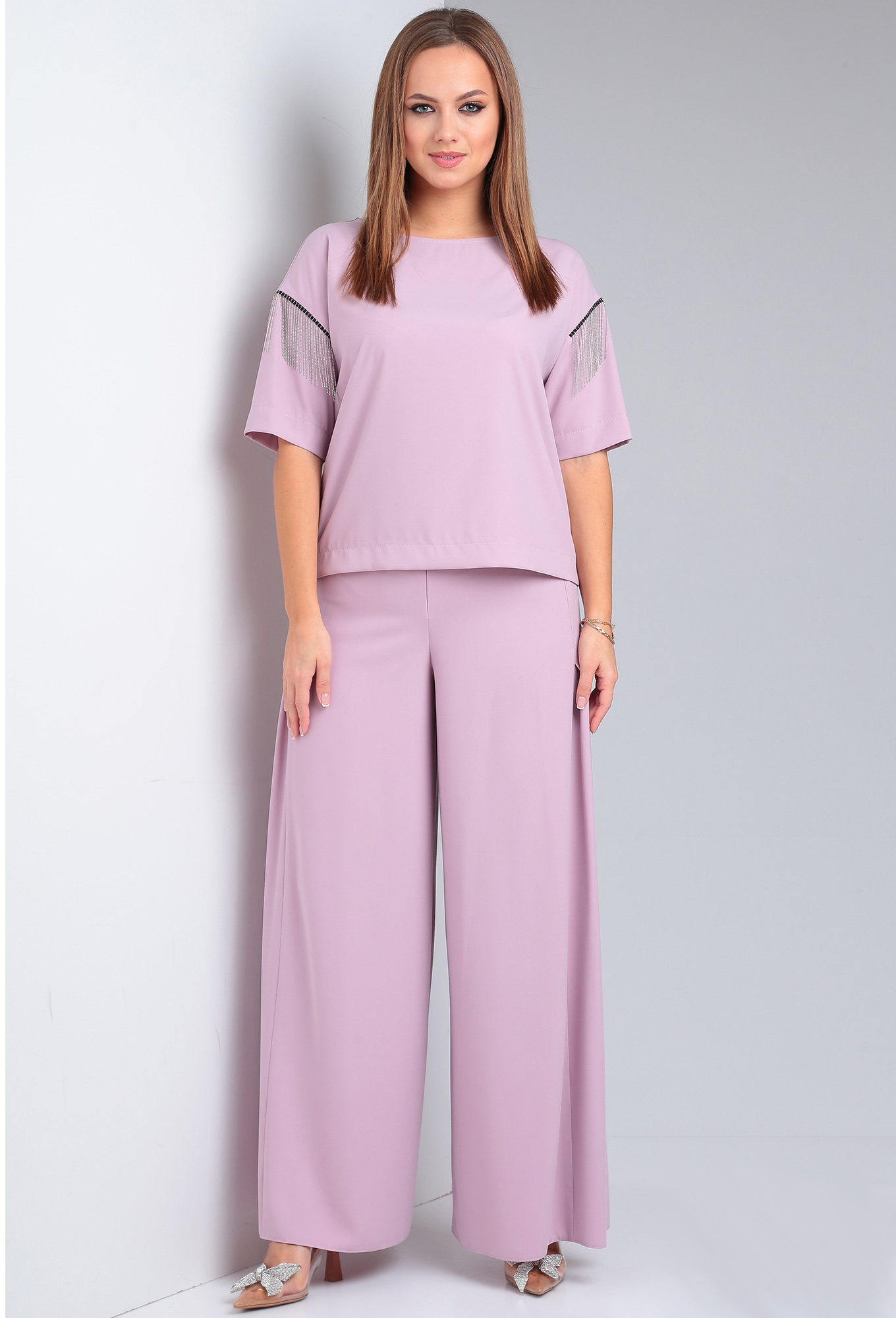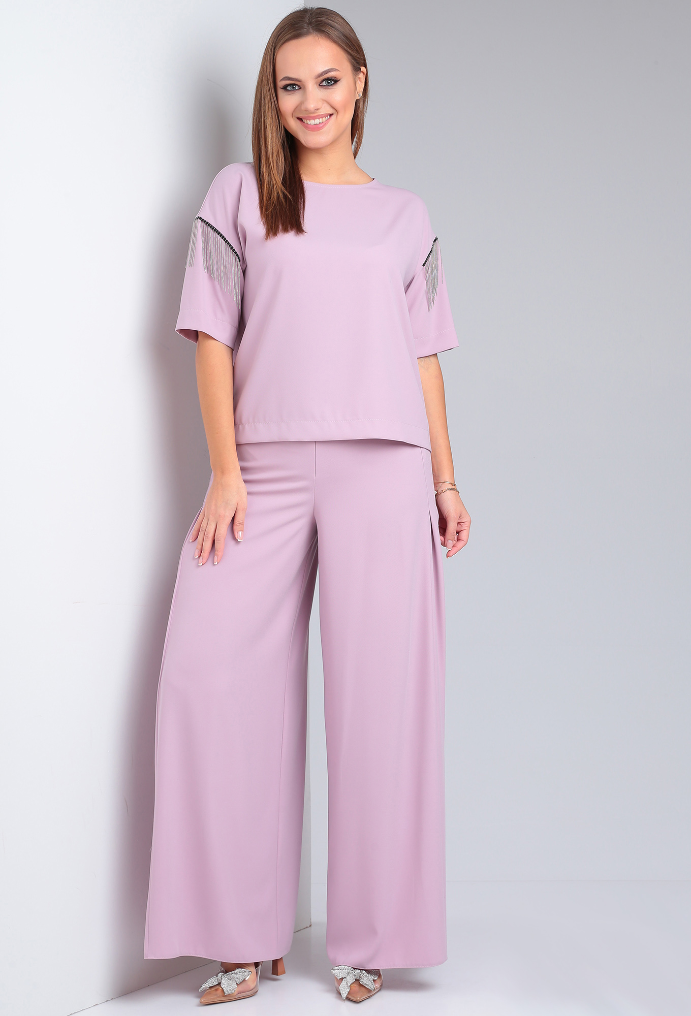 Модель: ВИЛЕНА 944 пудра Рост: 16..показать4 см (девушка на фото ростом 170см) Сезон: Весна-Лето Тип ткани: 100% ПЭКостюм женский двухпредметный, состоит из блузы и брюк. Блуза прямого силуэта со спущенной линией плеча. Вырез горловины лодочкой. Спинка цельная. В боковых швах обработаны разрезы. Рукав короткий одношовный, декорированный в верхней части тесьмой - бахромой. Брюки расширенные к низу с притачным поясом. Застёжка на потайную тесьму - молнию в среднем шве и 1 петлю-пуговицу по поясу. На передних и задних половинках обработаны вытачки. По верхней части передних половинок брюк застрочены 4 односторонние складки с двух сторон.