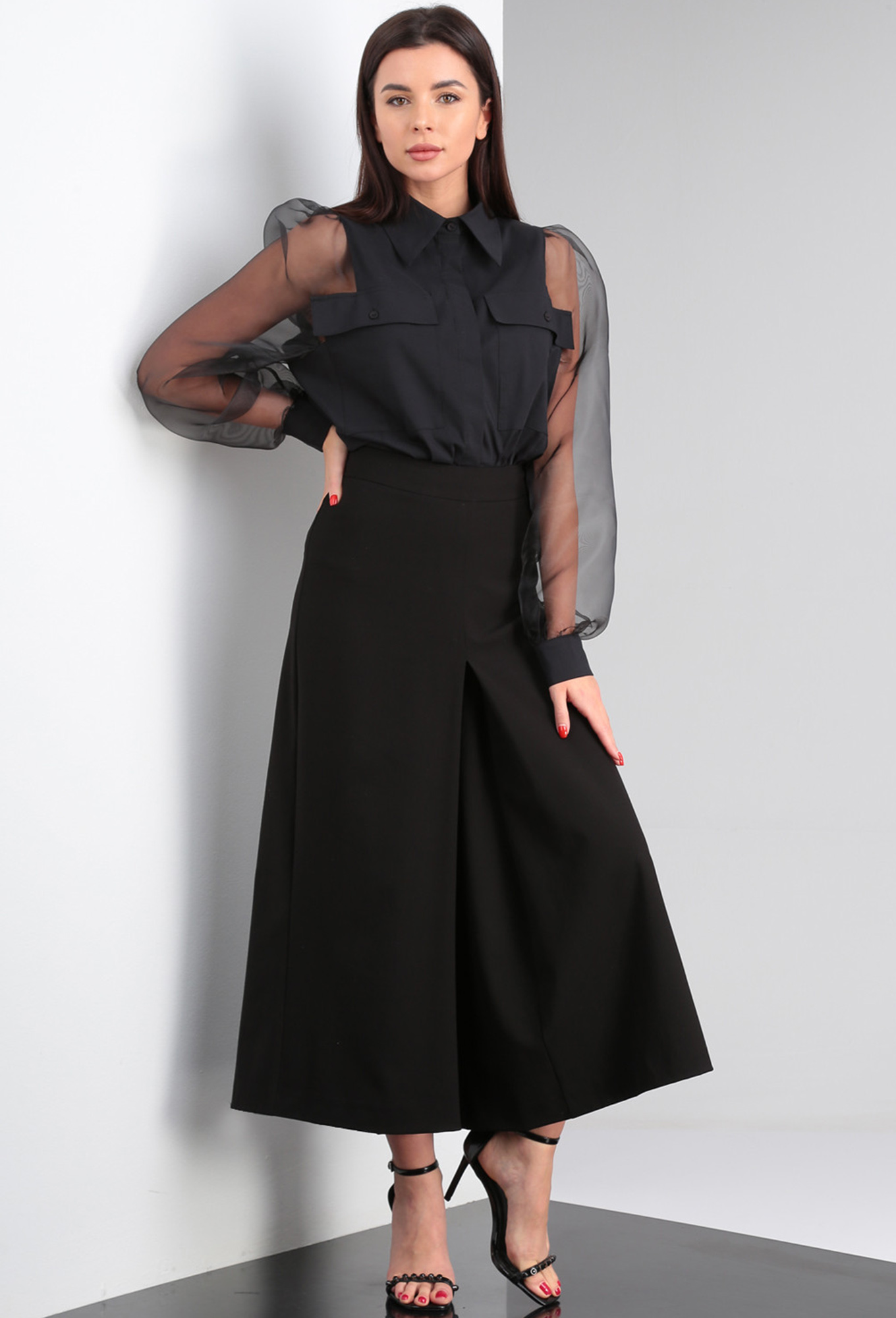 Модель: Виола Стайл 20366 чёрный ..показатьРост: 164 см (рост модели на фото 170см) Сезон: Круглогодичный Тип ткани: Блузка- Хлопок 95%, спандекс 5%Юбка-брюки- полиэстер 63%, вискоза 32%, спандекс 5%Комплект из двух предметов: блузка и юбка-брюки. Нарядная блузка из рубашечной ткани в сочетании с полупрозрачной органзой в рукавах. Застежка на цельнокроеную планку с пуговицами, отложной воротник на отрезной стойке. Рукава со сборкой по окату и внизу, на притачной манжете с застежкой на пуговицы. На переде настрочены накладные карманы с клапанами. Трендовая юбка-брюки элегантного силуэта из костюмной ткани. Пояс притачной с застежкой на потайную молнию сбоку.