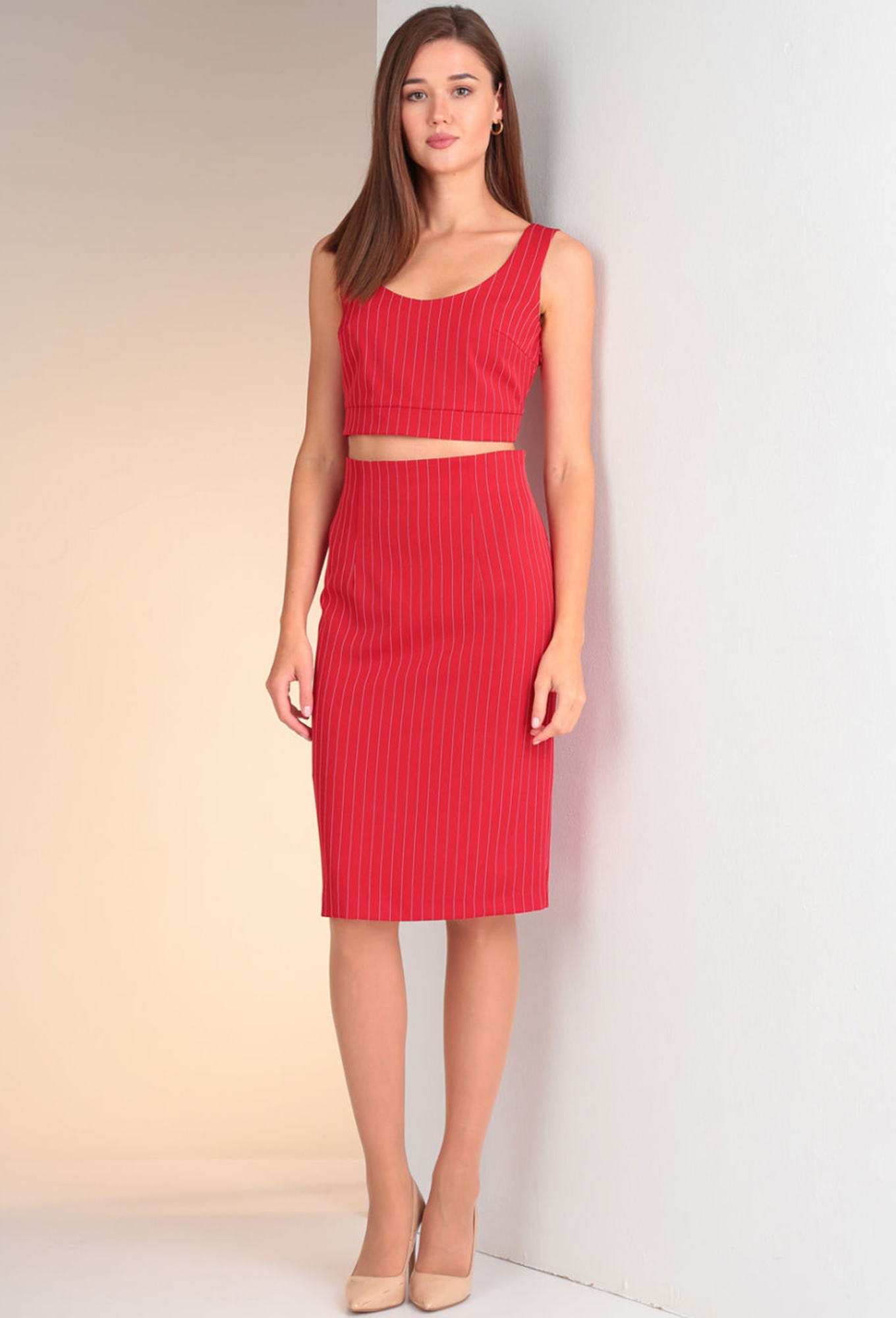 Модель: Виола Стайл 20435 красный в полоск..показатьу Рост: 164 см (рост модели на фото 170см) Сезон: Весна-Лето Тип ткани: Полиэстер 65% , вискоза 32% , эластан 3%Стильный костюм из двух предметов: топ и юбка. Топ с V-образным вырезом спереди и застежкой на молнию на спине. Классическая юбка прямого силуэта. Сзади юбка со средним швом, застежкой на потайную молнию и разрезом по низу, верх частично на резинке.