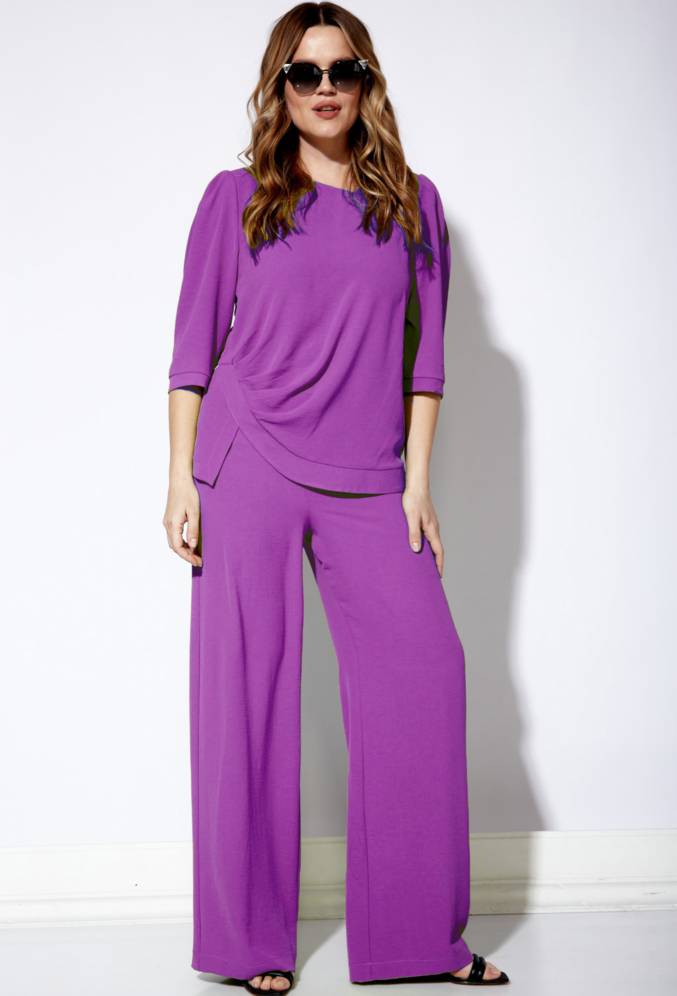 Модель: Виола Стайл 20635 фуксия ..показатьРост: 164 см (рост модели на фото 170см) Сезон: Весна-Лето Тип ткани: Полиэстер 76%, хлопок 22%, эластан 2%Костюм из двух предметов: блуза и брюки. Струящаяся блуза прямого силуэта с ассиметричным V-образным вырезом горловины. Рукава втачные с небольшой сборкой по окату и притачными манжетами по низу с разрезом. Перед с ассиметричным низом , отрезной планкой и сборкой по правой стороне. Брюки прямого силуэта на притачном поясе с резинкой.