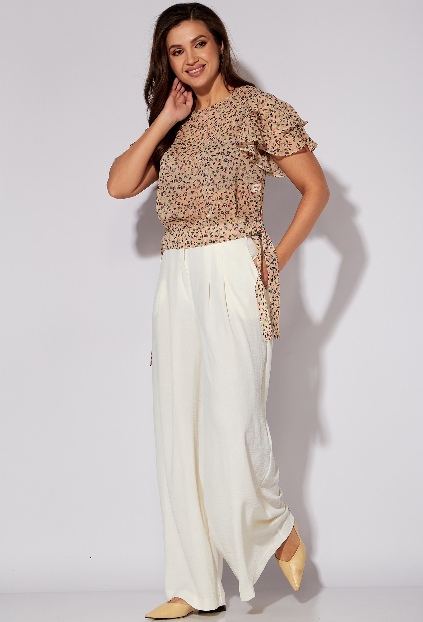Модель: Виола Стайл 20637 бежевый цветы..показатьi> Рост: 164 см (рост модели на фото 170см) Сезон: Весна-Лето Тип ткани: Блуза- Полиэстер 100%Брюки- Хлопок 76%, Полиэстер 27%, Эластан 2%Комплект женский, состоит из блузки и брюк. Блузка прямого силуэта с двойными втачными воланами рукавами. По низу переда и спинки плеточная кулиса регулирующаяся с двух сторон декоративным широким поясом. Горловина окантована точка брюки палаццо. На приточном поясе частично регулируемым резинками на одну петлю и пуговицу. По передней части обработано четыре складки, карманы и застёжка на тесьму молнию. Подгибка широкая застрочена отделочной строчкой на 4 см.