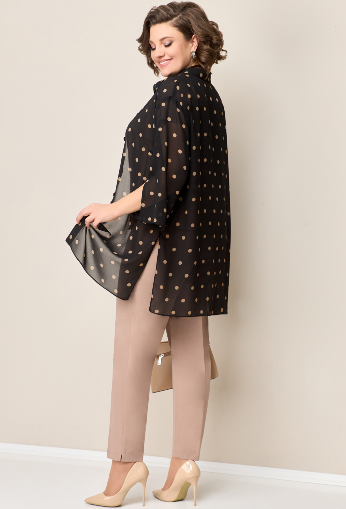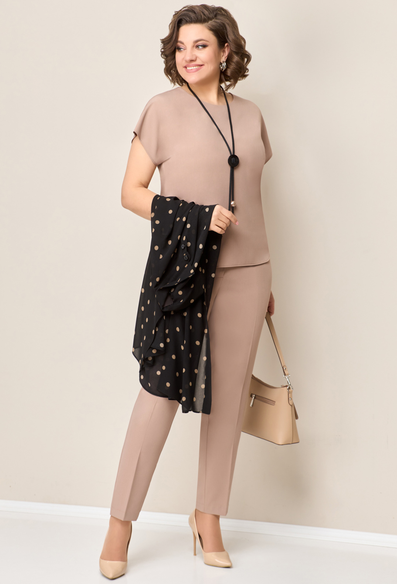 Модель: Волна 1327 черно-бежевый ..показатьРост: 164 см (девушка на фото ростом 170см) Сезон: Круглогодичный Тип ткани: Блуза- полиэстер 100%Топ,брюки- полиэстер 53%, вискоза 44%, спандекс 3%Легкая удлиненная блуза из шифона с застежкой на пуговицы. Рукав блузы чуть спущенный, втачной, книзу с разрезом, длина рукава 48см. Длина блузы по центру спинки-101 см. Брюки из текстиля, прямые с высокой посадкой, с притачным поясом на резинке. Длина брюк по боковому шву- 100см. Топ со спущенным коротким рукавом. Длина топа по центру спинки-58см. Украшение в виде подвески- в комплекте изделия.Рост: 164 см (девушка на фото ростом 170см)