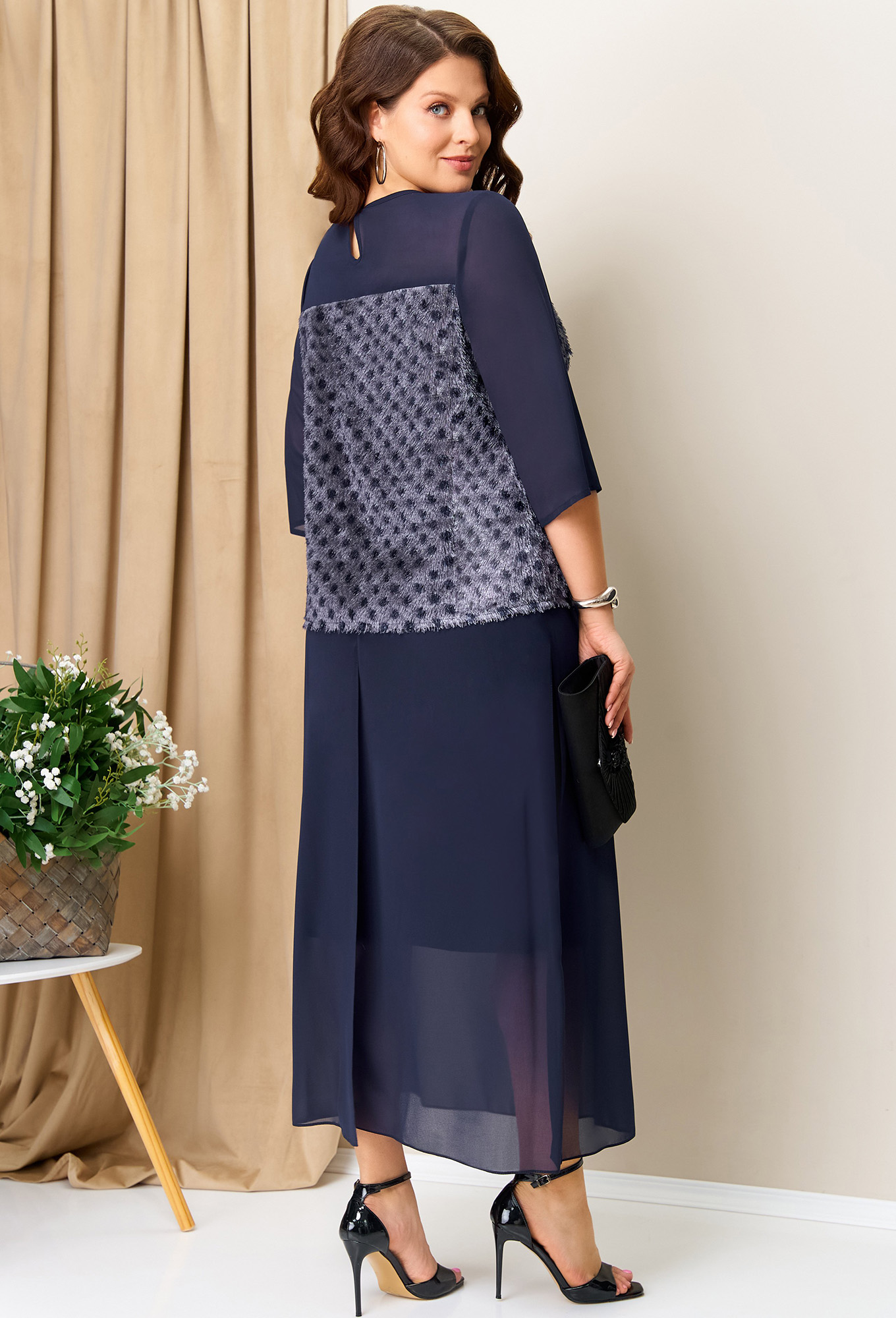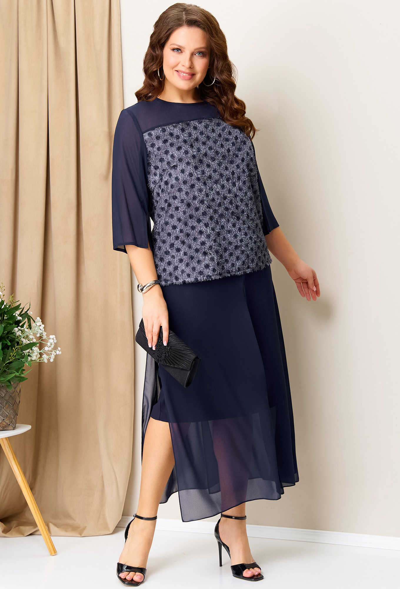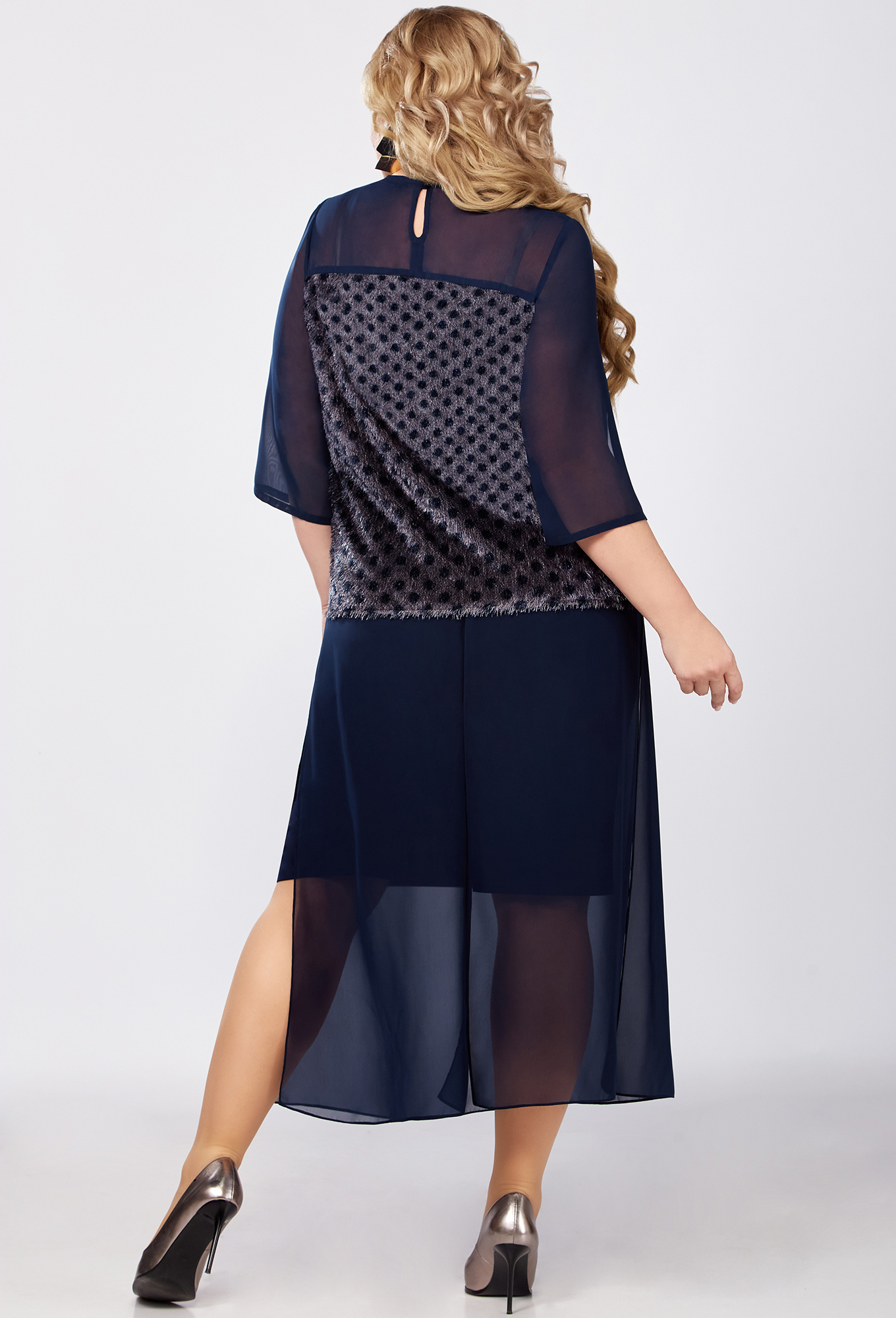 Модель: Волна 1391 т.синий Рост: ..показать164 см (девушка на фото ростом 170см) Сезон: Круглогодичный Тип ткани: Блуза- полиэстер 75%, вискоза 20%, спандекс 5%Юбка- полиэстер 51%, вискоза 46%, спандекс 3%Нарядная блуза - джемпер из ткани "травка" на основе легкого трикотажа. Силуэт блузы прямой. Втачные рукава с разрезом и верхняя часть блузы - из шифона. Длина блузы по центру спинки - 60 см. Длина рукава - 43. По спинке блузы - застежка на пуговицу. Двойная летящая юбка с верхним слоем из шифона, с глубокими разрезами.