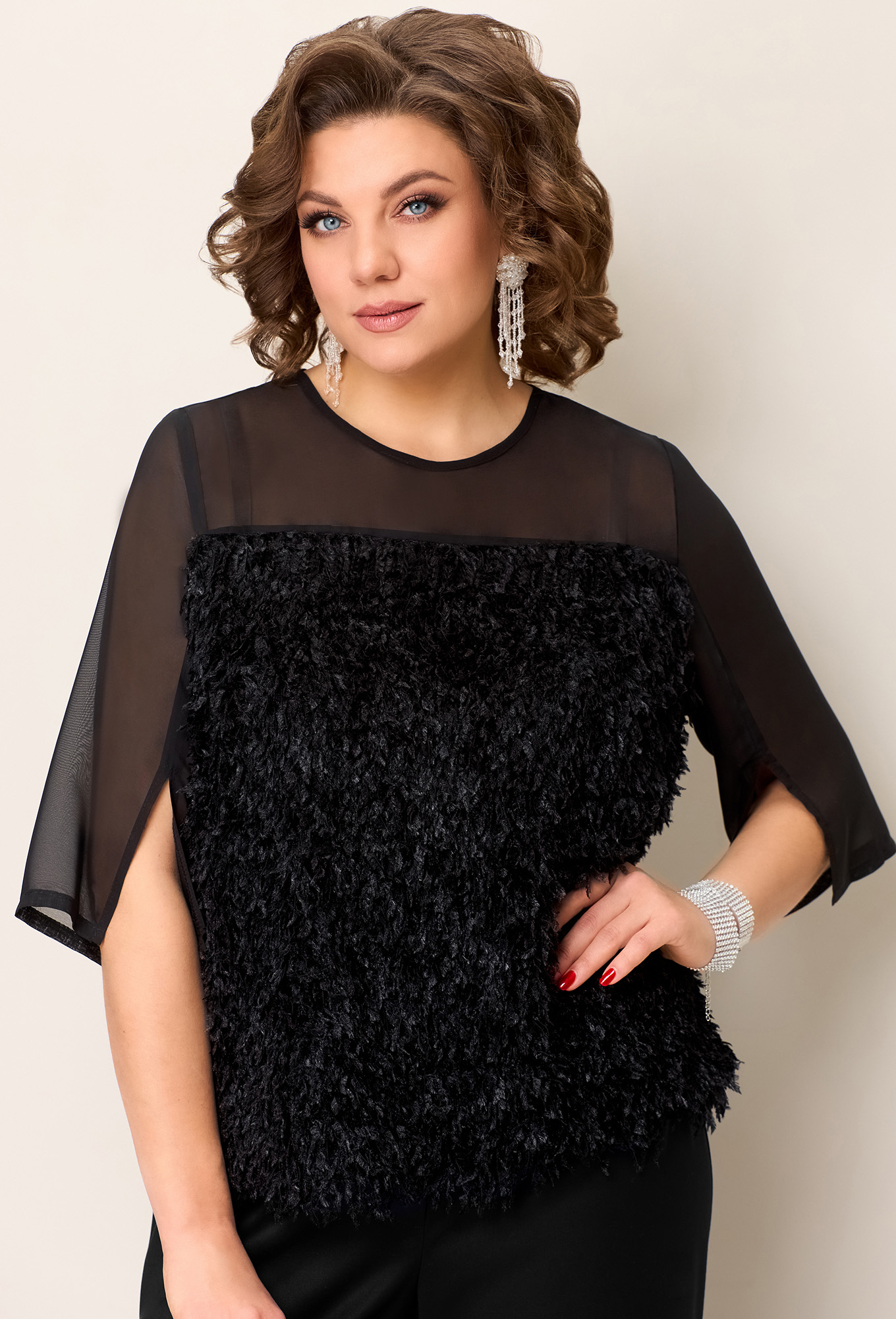 Модель: Волна 1392 черный Рост: 1..показать64 см (девушка на фото ростом 170см) Сезон: Круглогодичный Тип ткани: Блуза- полиэстер 75%, вискоза 20%, спандекс 5%Брюки- полиэстер 51%, вискоза 46%, спандекс 3%Нарядная блуза-джемпер из ткани "травка" на основе легкого трикотажа. Силуэт блузы прямой. Втачные рукава с разрезом и верхняя часть блузы - из шифона. Длина блузы по центру спинки - 65 см. Длина рукава - 43 см. По спинке блузы - застежка на пуговицу. Брюки прямые свободные с высокой посадкой, с притачным поясом (в поясе - вставки с резинкой и застежка на молнию и пуговицу спереди). Длина брюк по боковому шву - 104см64 см (девушка на фото ростом 170см)