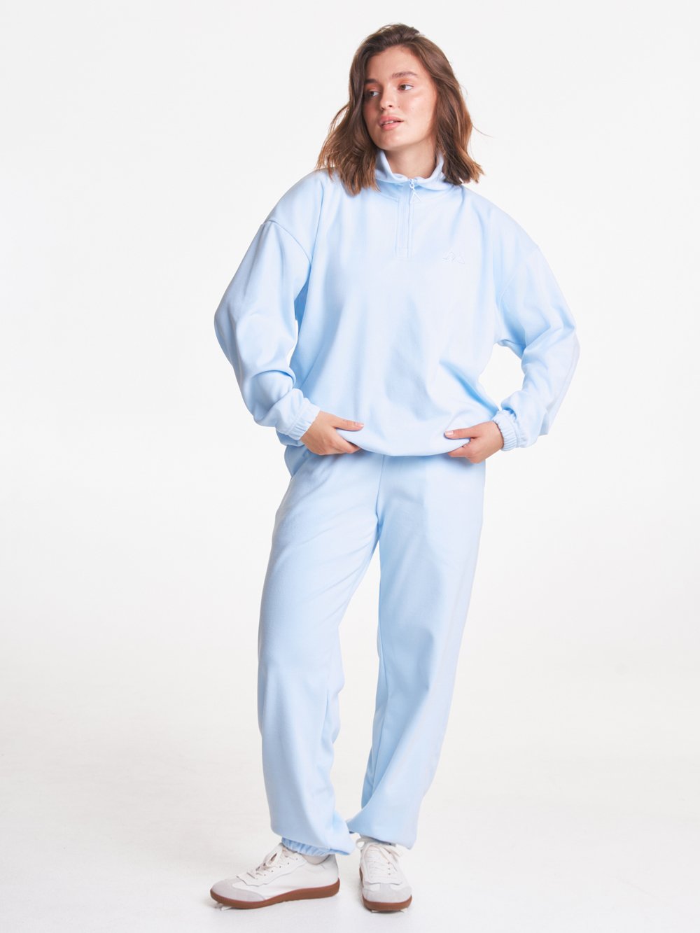 Комплект из джемпера и брюк свободного кроя. Джемпер с частичной застежкой на молнию по переду, удобным воротником-стойкой и утяжкой по низу изделия. Брюки с поясом на резинке с дополнительной утяжкой, манжетами на резинке и карманами в боковых швах.