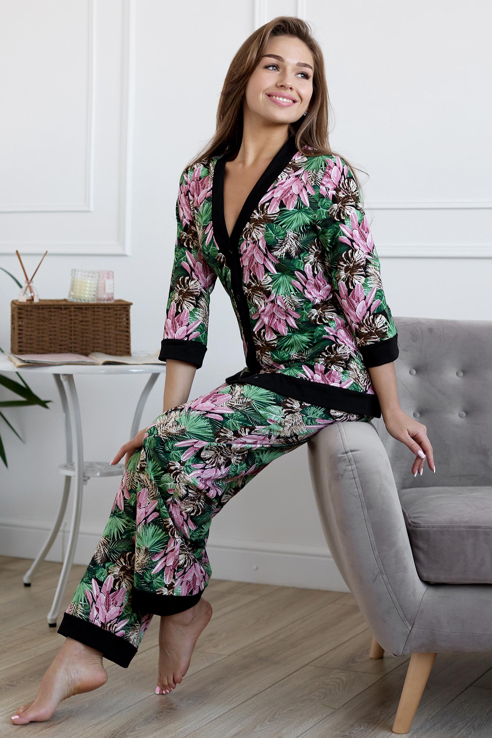 Нежный и мягкий женский комплект из 100% хлопка. Состоит из кофточки на пуговицах свободного кроя и легких, широких брюк. Красивое цветовое сочетание подчеркивает женственность своей обладательницы. Отличный подарок для подруги, сестры, мамы на любой праздник.