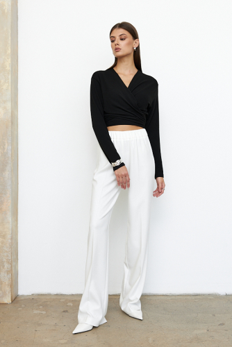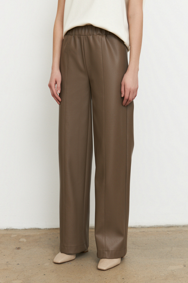 Брюки прямого силуэта из эластичного полотна, с покрытием, имитирующим кожу. По центру передней части брючин выполнен шов с декоративной строчкой. Пояс с эластичной резиной.