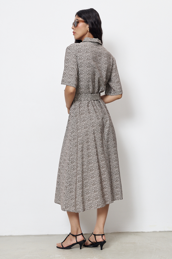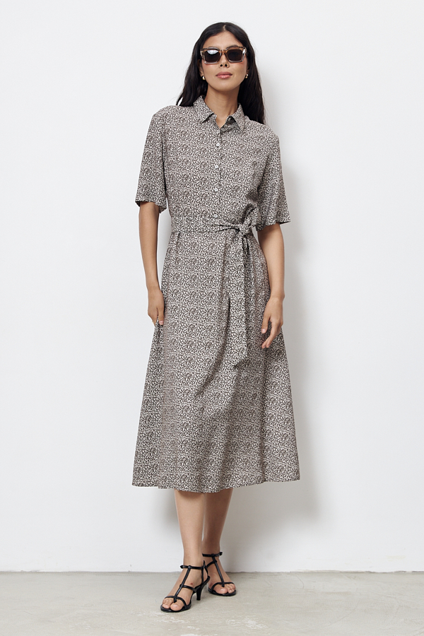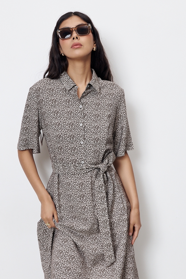Платье полуприлегающее в области груди и свободное в области бедер из вискозной ткани. Изделие отрезное по линии талии. Лиф с застёжкой на пуговицы. Вырез горловины обработан отложным воротником на стойке. Втачной короткий рукав. В комплекте пояс из основной ткани.