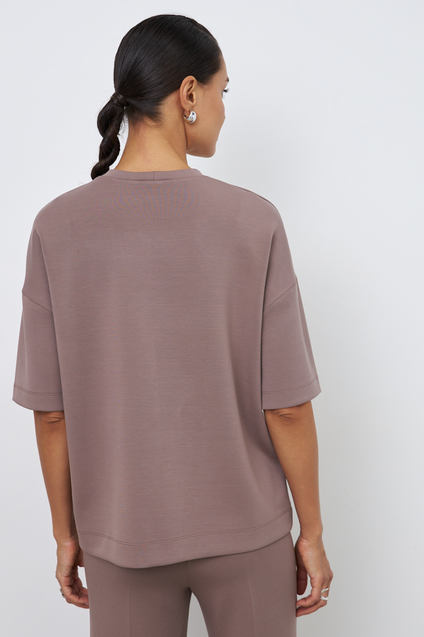 Джемпер свободного силуэта со спущенной линией плеча и рукавом до локтя выполнен из эластичного полотна. Вырез горловины оформлен бейкой из основной ткани. В таблице размеров представлены параметры человека, а не изделия.