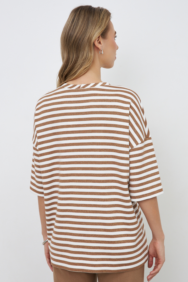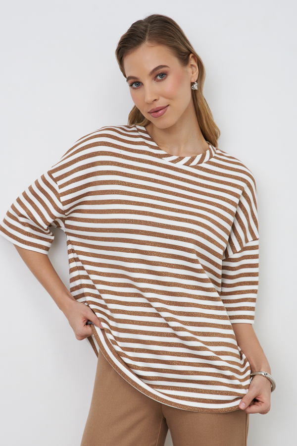 Джемпер свободного силуэта со спущенной линией плеча и рукавом до локтя выполнен из эластичного полотна. Вырез горловины оформлен бейкой из основной ткани. В таблице размеров представлены параметры человека, а не изделия.