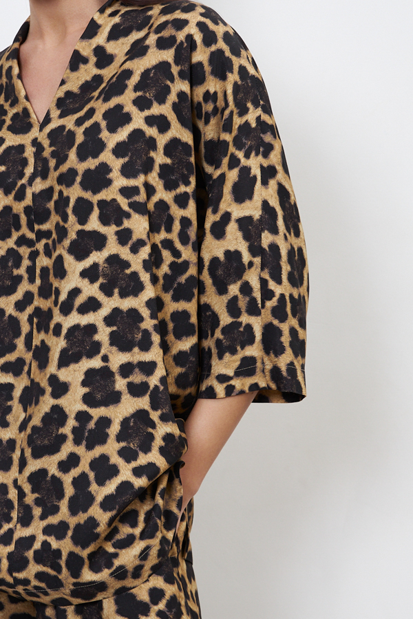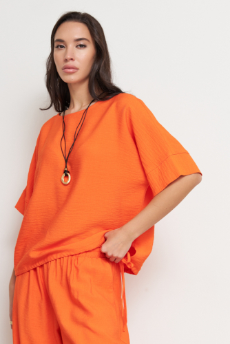 Блуза из вискозной ткани свободного силуэта с разрезами в боковых швах. По центру передней части изделия выполнен шов. Цельнокроеная стойка, переходящая в V-образный вырез горловины, визуально делает фигуру стройнее. Цельнокроеный рукав 3/4.