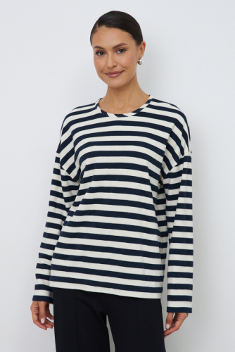 Джемпер из вискозного эластичного полотна свободного силуэта. Изделие оригинального кроя с цельнокроеным рукавом. Круглый вырез горловины и линия проймы окантованы эластичными бейками.