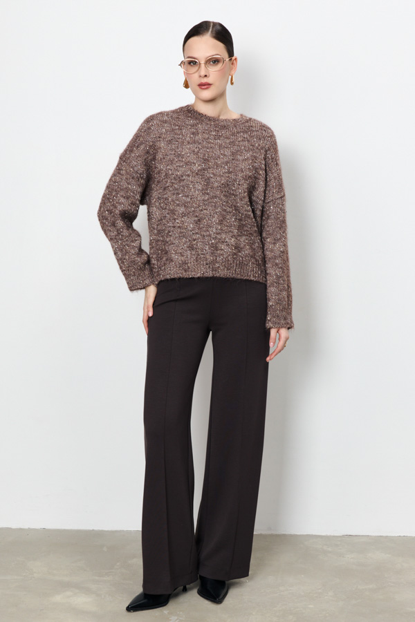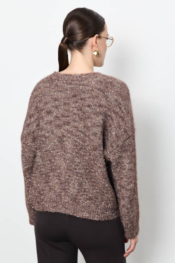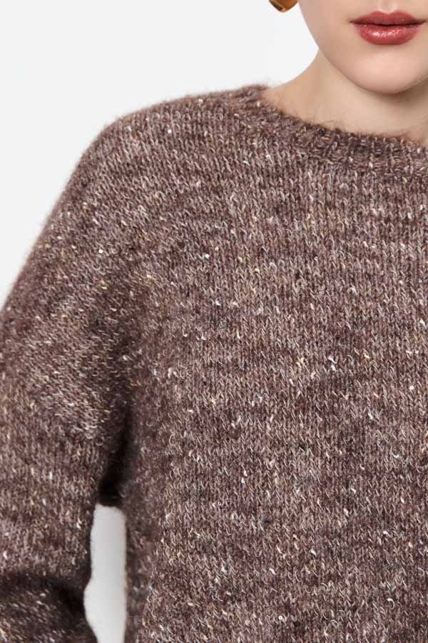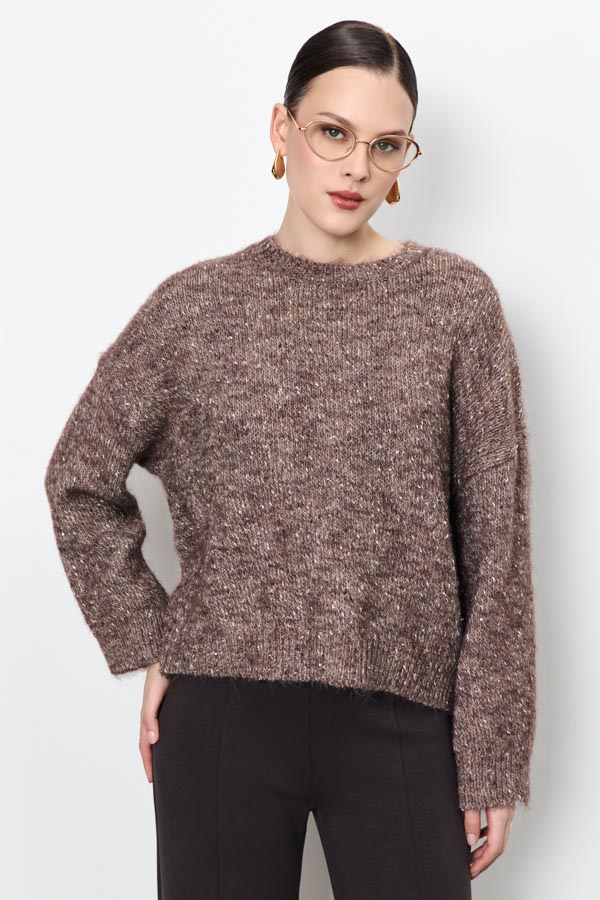 Этот джемпер свободного силуэта станет вашим любимым элементом гардероба. Длинные рукава со спущенной проймой добавляют расслабленности. Круглый вырез горловины, низ изделия и низ рукава оформлены резинкой. Изделие выполнено из меланжевой пряжи с пайетками.