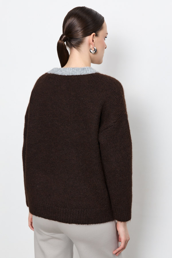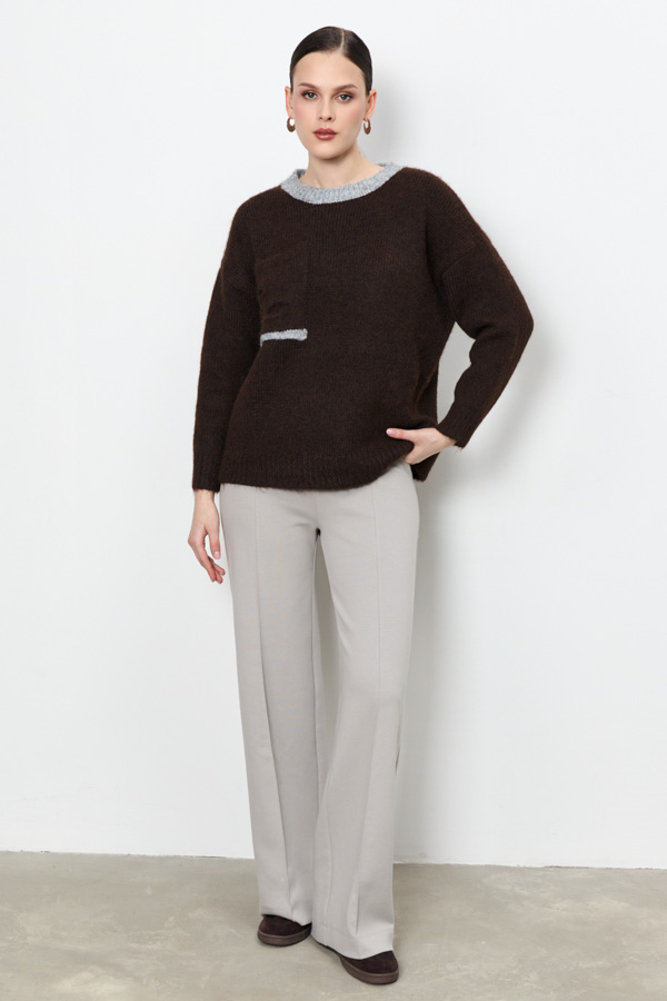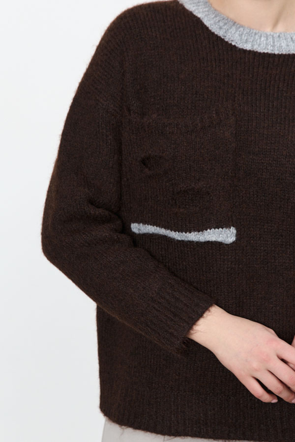 Этот джемпер – воплощение комфорта и стиля. Его свободный силуэт и спущенная пройма создают расслабленный, но элегантный образ. Низ изделия и низ рукава оформлены резинкой. Особый шарм придает контрастный круглый вырез горловины и оригинальный накладной карман на передней части, который добавляет изюминку. Изделие выполнено из мягкой пряжи.