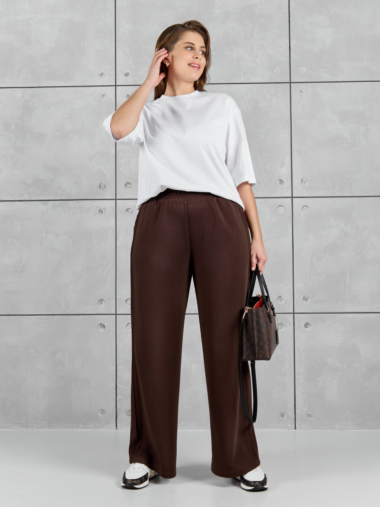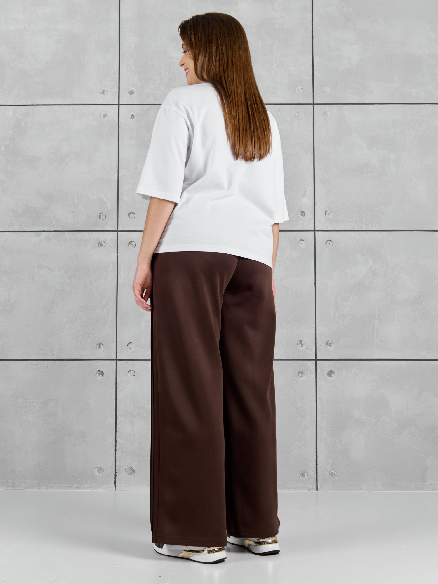 Брюки женские из гладкокрашенного трикотажного полотна «лининг» прямого кроя, длинные, свободные, расширенные к низу, на поясе с эластичной тесьмой внутри, карманами в боковых швах. Передние половины застрочены двумя параллельными линиями, смещенными к боковым швам.