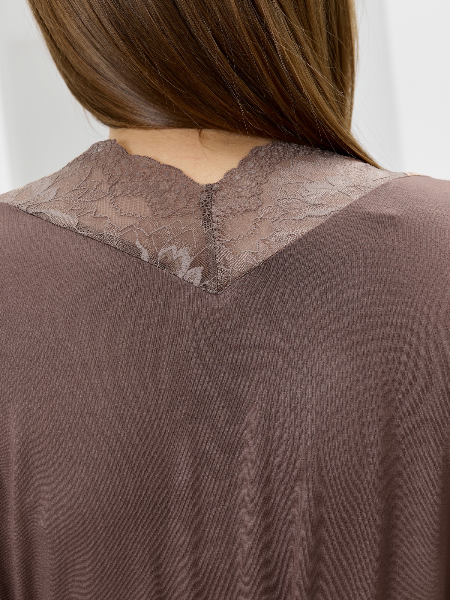 Халат из гладкокрашеного трикотажного вискозного полотна, на запахе, с втачными рукавами 3/4 длины, кружевными манжетами, притачной планкой по бортовым срезам и съемным поясом, продетым через две шлевки в боковых швах. Спинка с кружевной притачной кокеткой - V-образной формы, бортовая планка с кружевными вставками, переходящими на полочку.