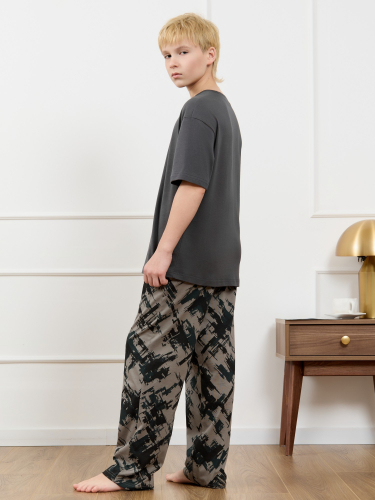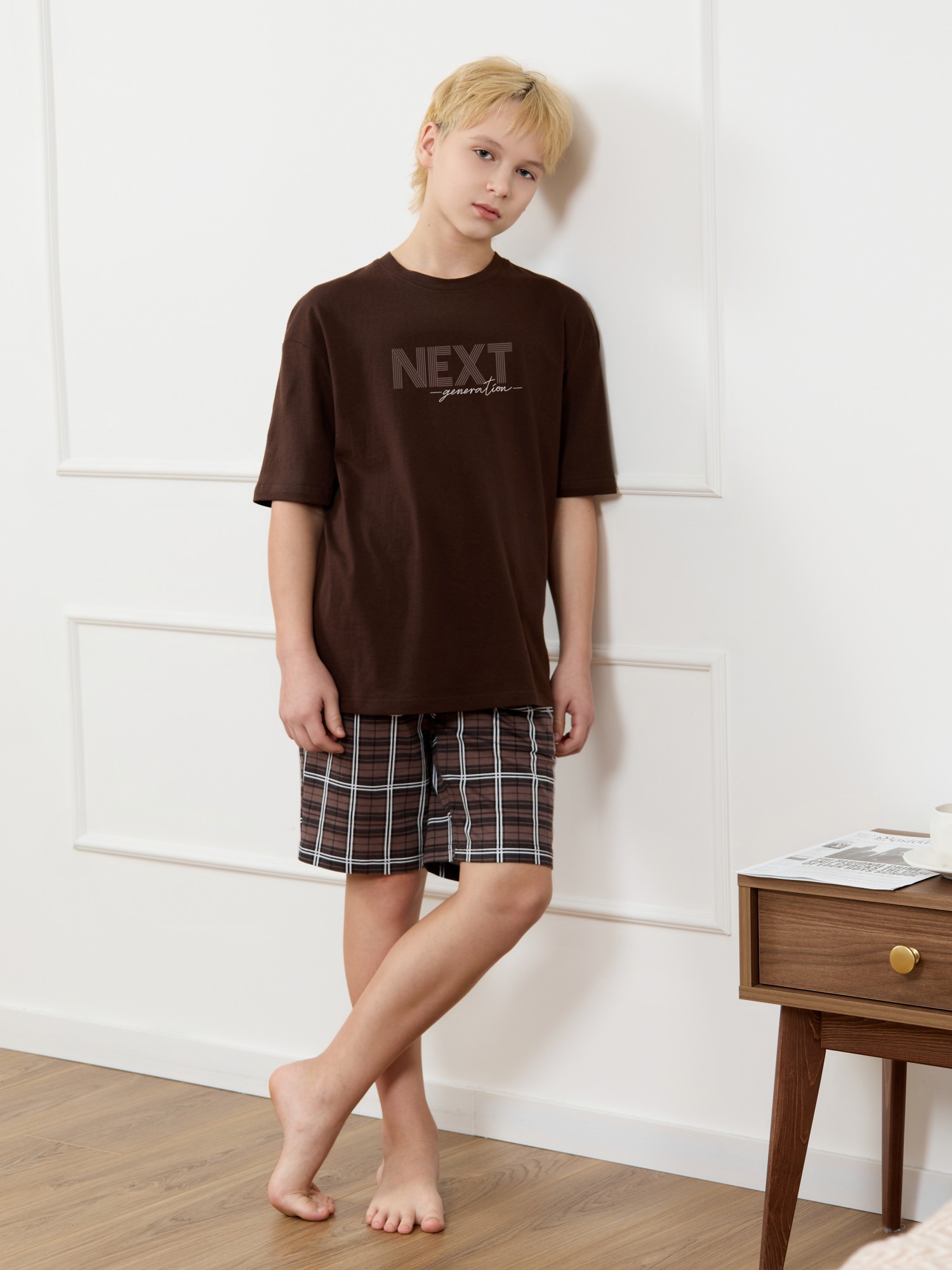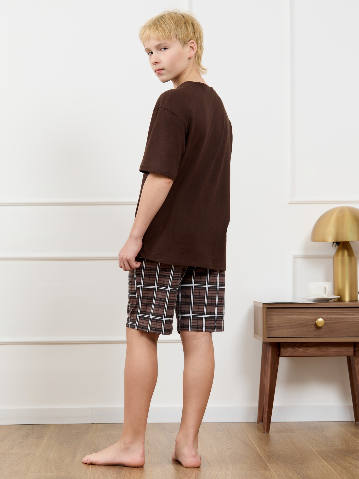 Костюм для мальчика из трикотажного полотна "кулирка", состоящий из футболки и шорт. Футболка классического покроя, с короткими втачными рукавами и приспущенной линией плеч, горловиной овальной формы, обработанной втачной планкой и принтом на детали переда, выполненным в технике шелкографии. Нижние срезы рукавов и изделия обработаны подгибкой. По горловине настрочена отделочная строчка. Шорты длиной до колен, на притачном поясе с эластичной тесьмой внутри, с карманами в боковых швах. Нижние срезы обработаны подгибкой.
