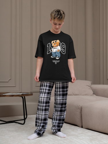 Костюм для мальчика, состоящий из футболки и брюк. Футболка однотонная с принтом на груди; модель свободная, со спущенной линией плеч, втачными короткими рукавами и овальным вырезом горловины. Брюки из полотна с набивным рисунком эксклюзивного дизайна, прямые, с боковыми карманами с обтачными входами, на притачном поясе с отстроченной эластичной тесьмой.