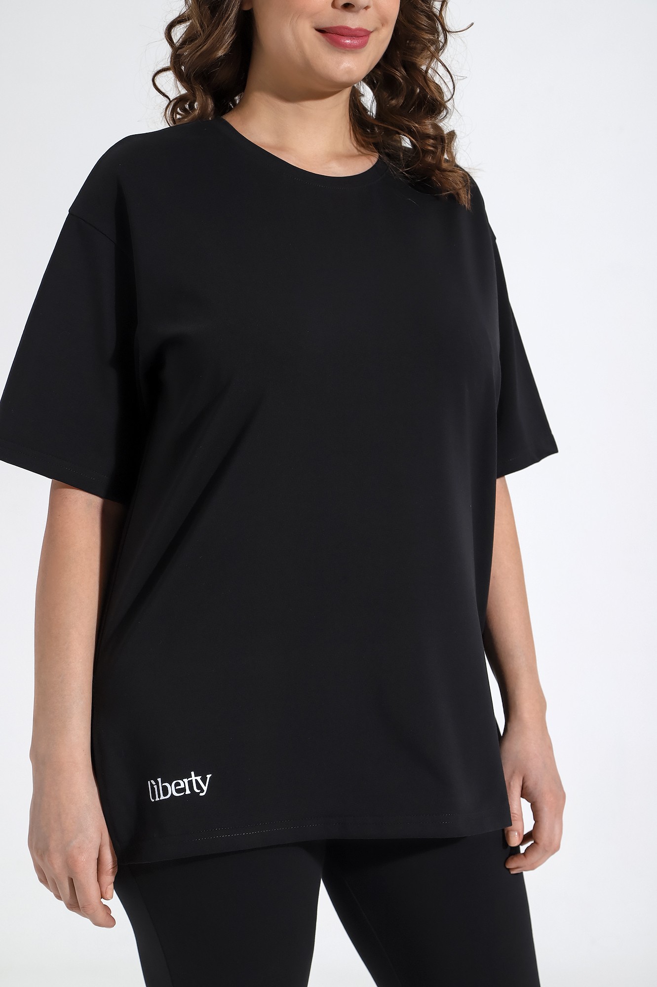 Костюм женский из трикотажного гладкокрашенного полотна «кулирка с лайкрой», состоящий из футболки и бридж. Футболка свободного покроя, со спущенным плечом и втачными рукавами длиной до локтя, горловиной овальной формы, обработанной втачной планкой и принтом на полочке, выполненным в технике «шелкографии». В нижней части боковых швов – разрезы.Бриджи – классического покроя, на резинке.