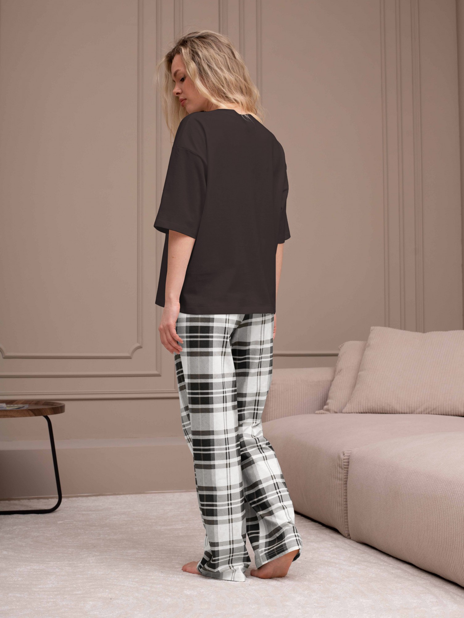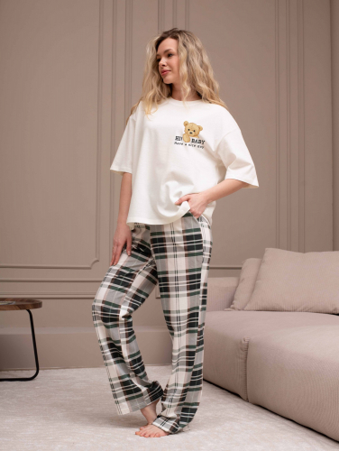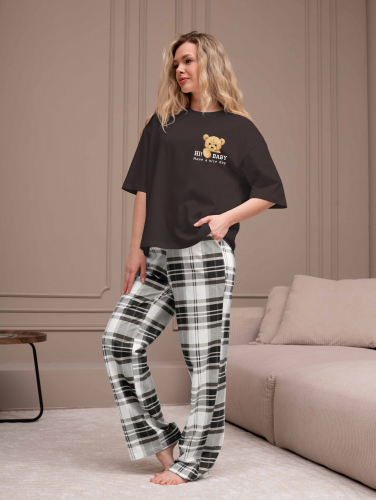 Костюм женский из трикотажного полотна "кулирка" в комбинации двух видов: гладкокрашеного и набивного с тематическим рисунком, состоящий из футболки и брюк. Футболка из гладкокрашеного полотна, свободного силуэта, со спущенной линией плеч и втачными короткими рукавами, горловиной овальной формы, обработанной втачной планкой и отделочной строчкой. В центре переда - принт, выполненгный в технике шелкографии. Брюки из полотна с набивным рисунком длинные, прямые, на притачном поясе с эластичной тесьмой внутри и карманами в боковыых швах.