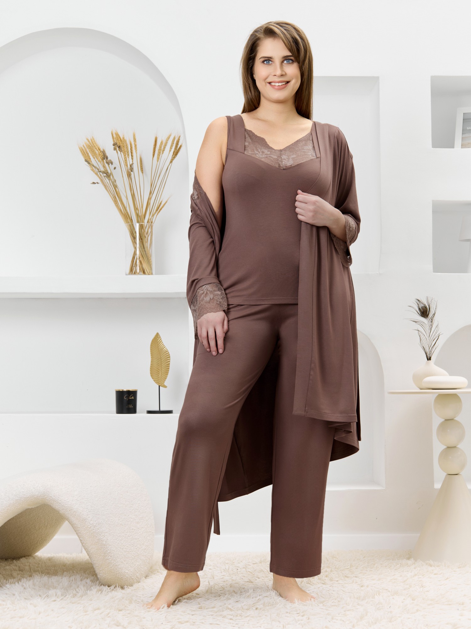 Пижама женская из гладкокрашеного трикотажного вискозного полотна с отделкой кружевом, состоящая из майки и брюк. Майка - свободного кроя, на широких двойных бретелях, с V-образным вырезом горловины. Полочка и спинка состоят из двух деталей с отрезной кружевной кокеткой. Проймы окантованы основным материалом.Брюки – свободные, средней длины, слегка зауженные книзу, с эластичной тесьмой по талии.