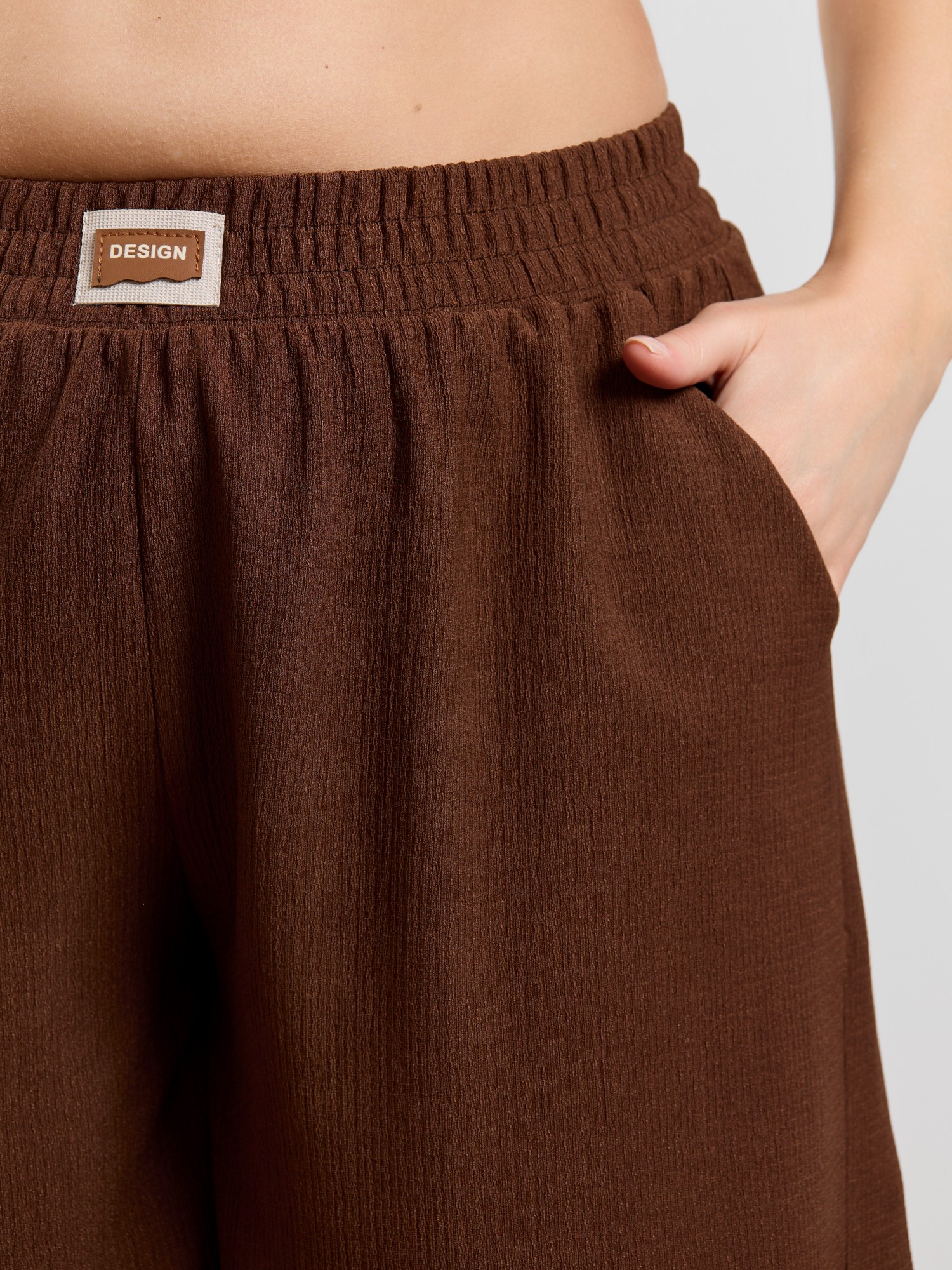 Шорты женские из гладкокрашенного трикотажного полотна «бурумчук», свободные, средней длины, с карманами в боковых швах, на притачном поясе с эластичной тесьмой внутри.