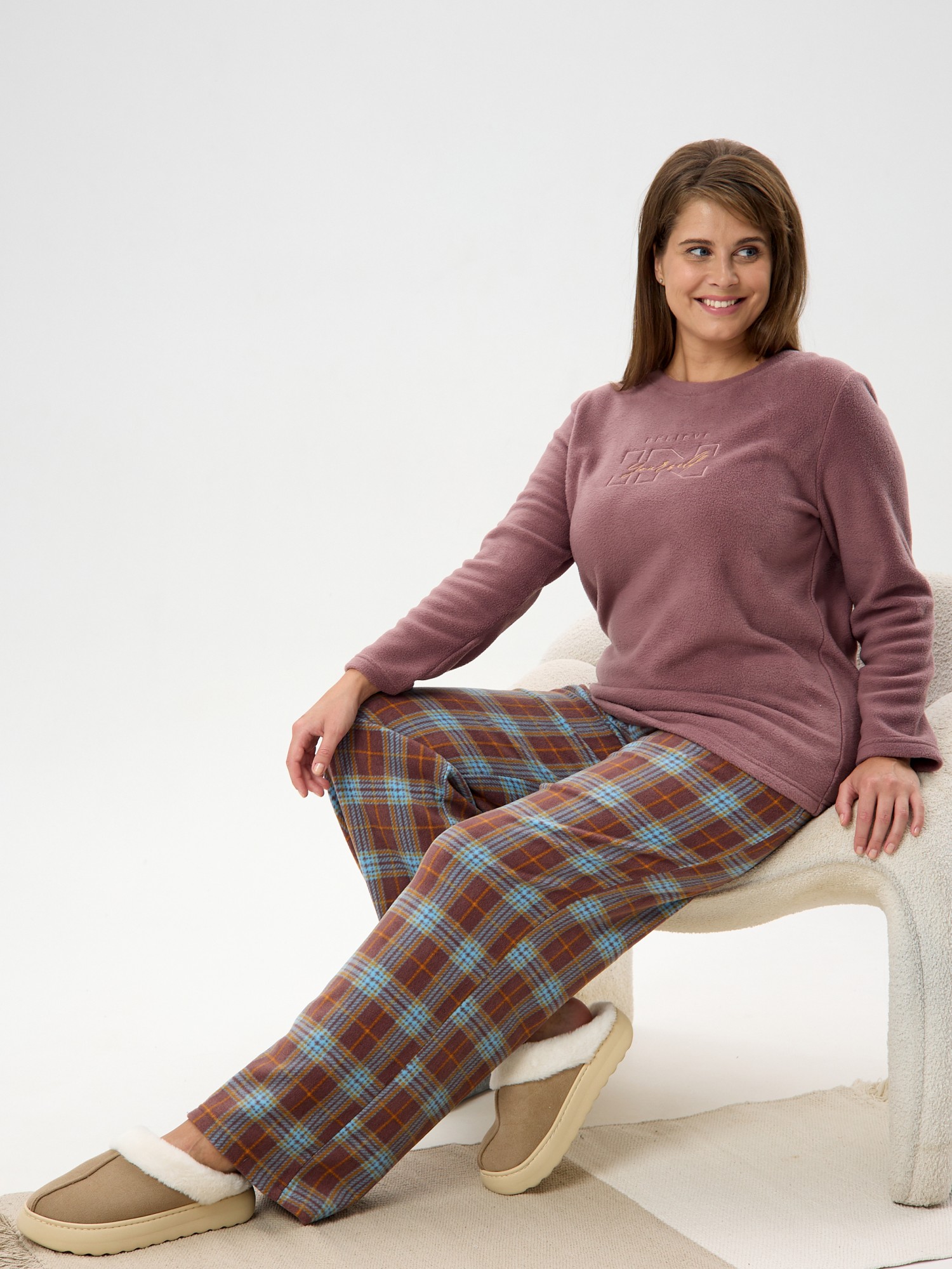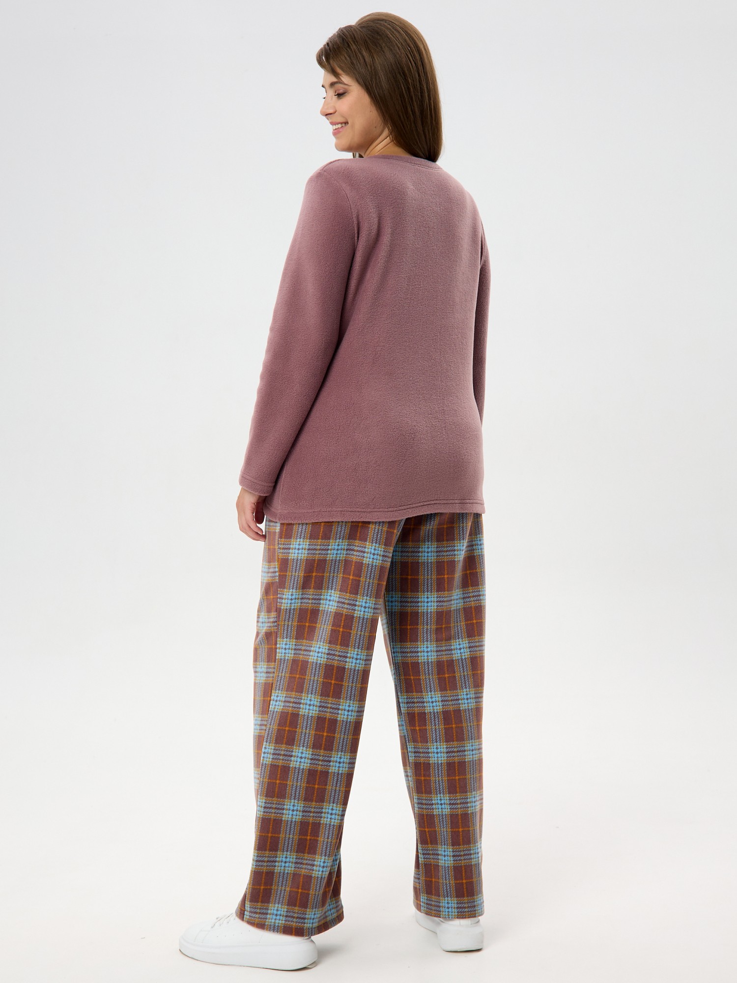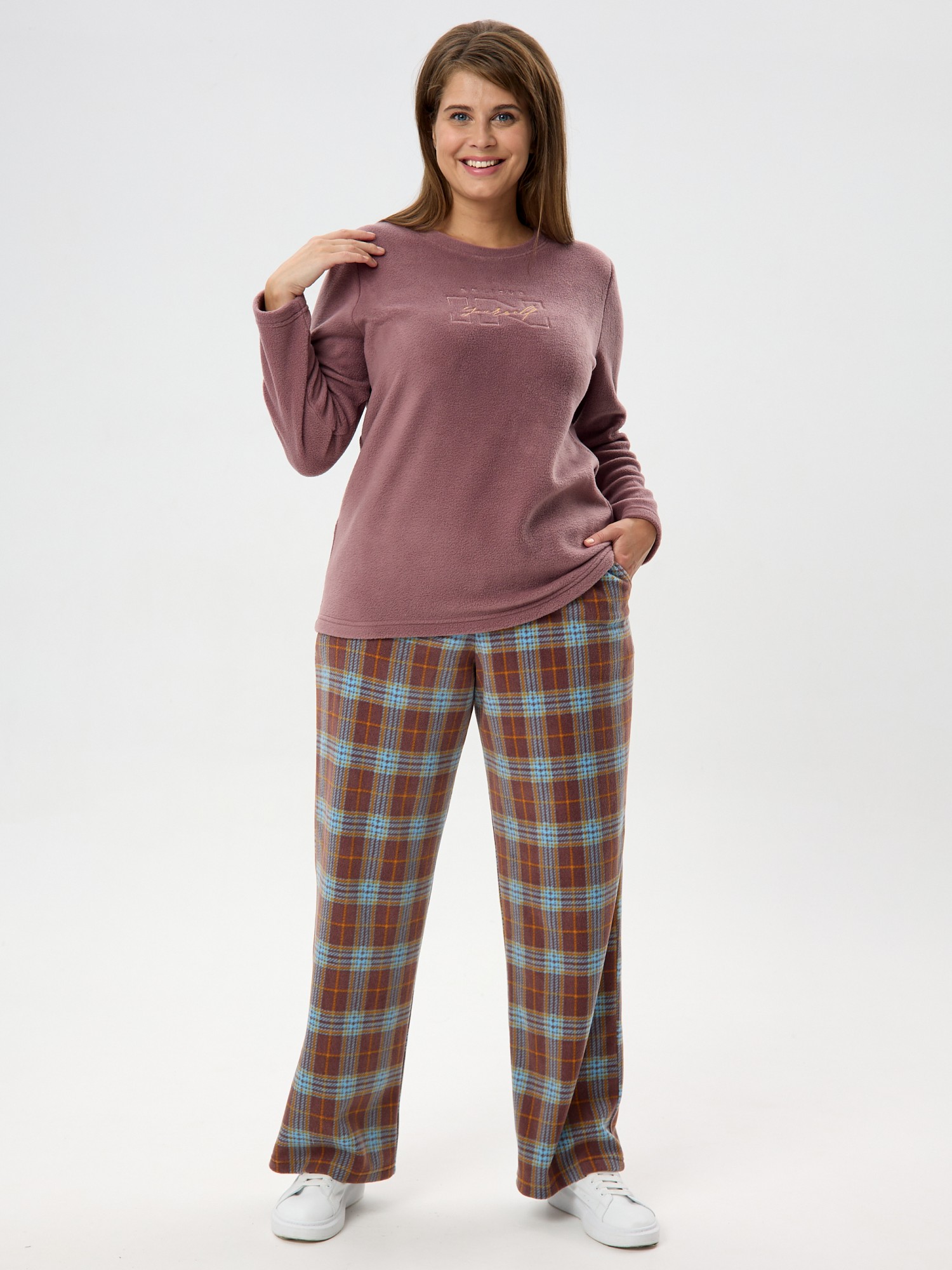 Костюм женский из трикотажного полотна «флис» в комбинации двух видов: с набивным рисунком «клетка» и гладкокрашеного в единой цветовой гамме, состоящий из джемпера и брюк.Джемпер - из гладкокрашенного полотна, классического покроя, с длинными втачными рукавами, горловиной овальной формы, обработанной втачной планкой и вышивкой в центре полочки.Брюки – из полотна с рисунком в клетку, длинные, свободные, на поясе с эластичной тесьмой внутри и карманами в боковых швах.