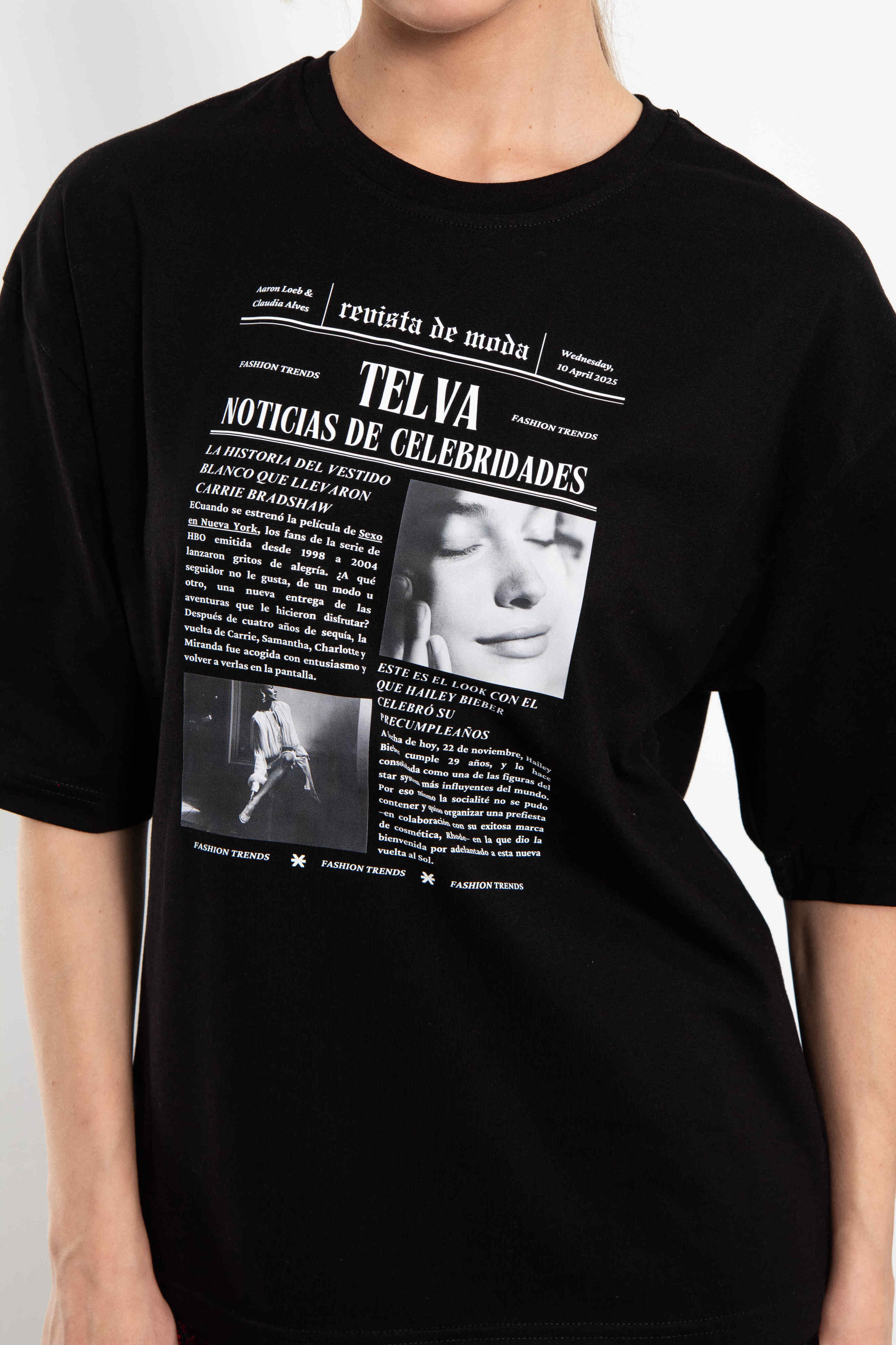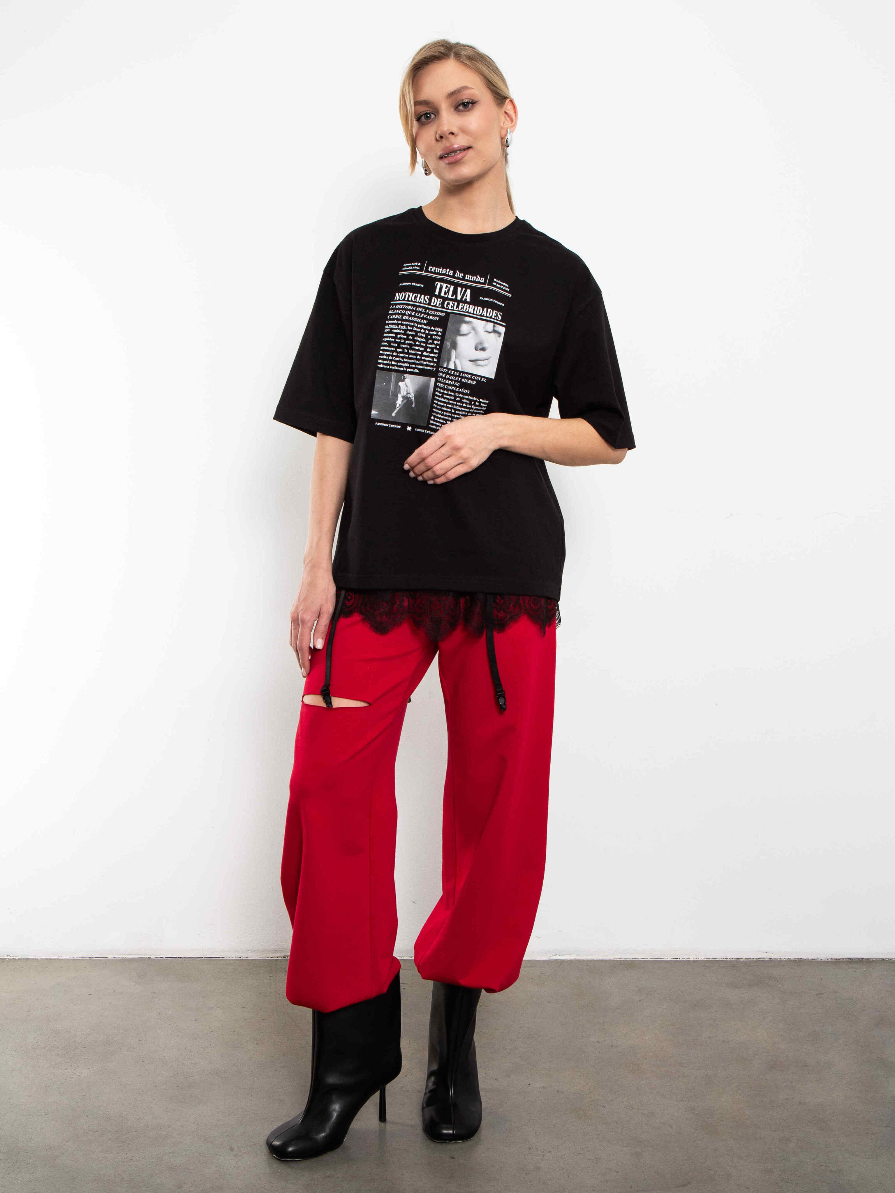 Контрастный монохромный принт с журнальной версткой добавляет образу интеллектуальный и слегка дерзкий характер, делая модель акцентной, но универсальной.