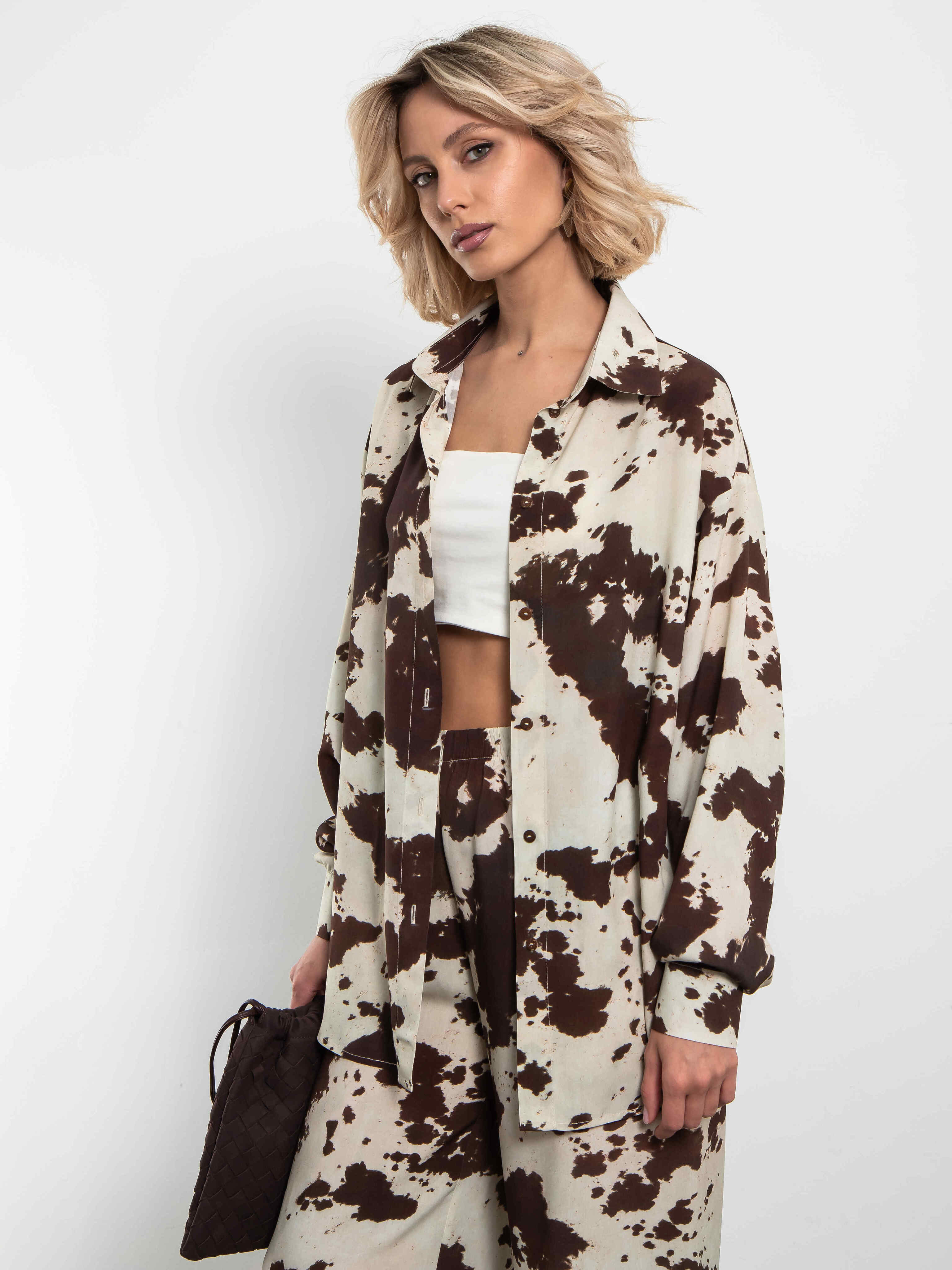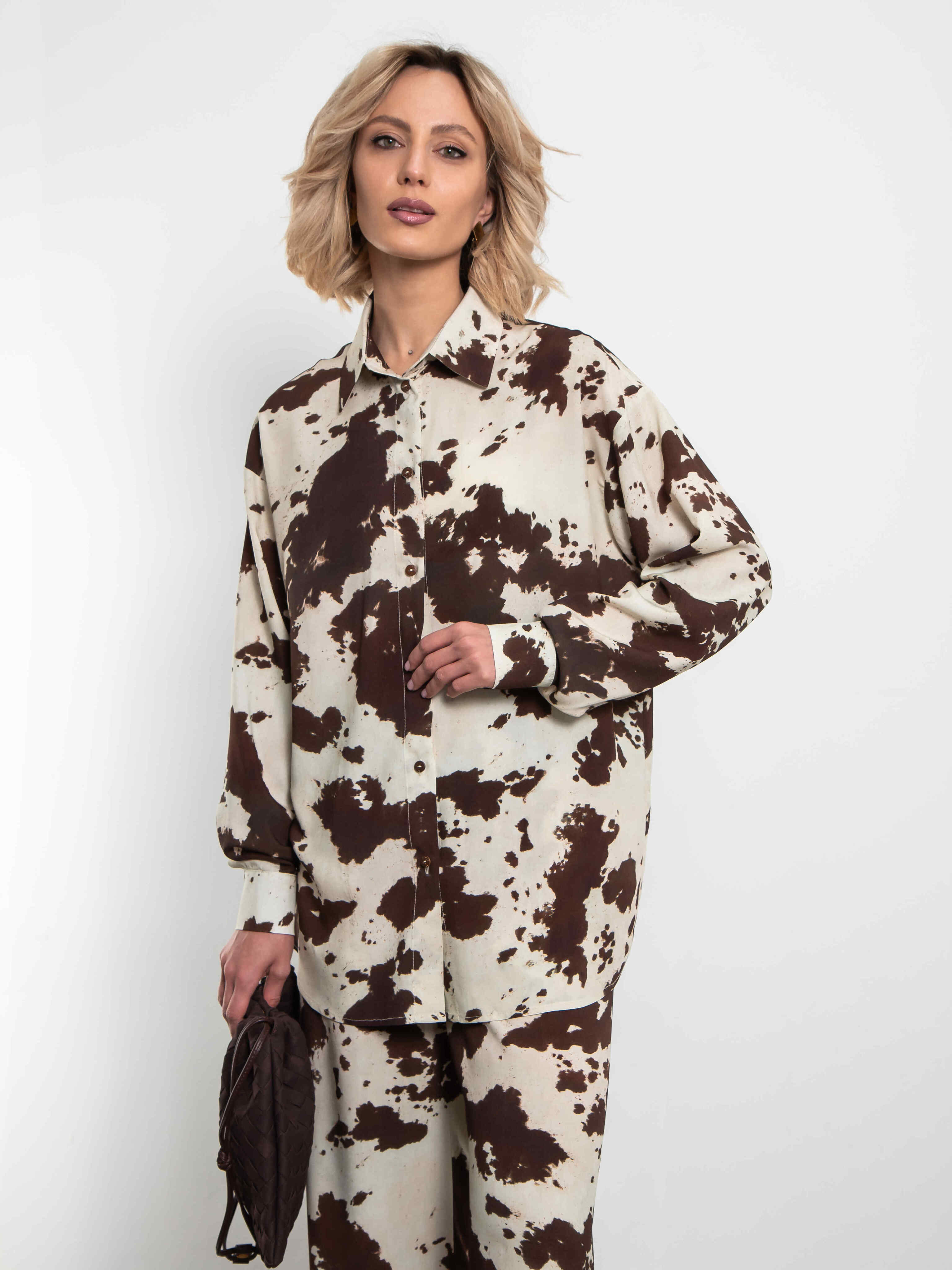 Яркий акцент сезона — свободная рубашка с модным коровьим принтом в коричнево-молочной гамме. Анималистичный паттерн выглядит смело и стильно, идеально подходя для повседневных и вечерних образов.