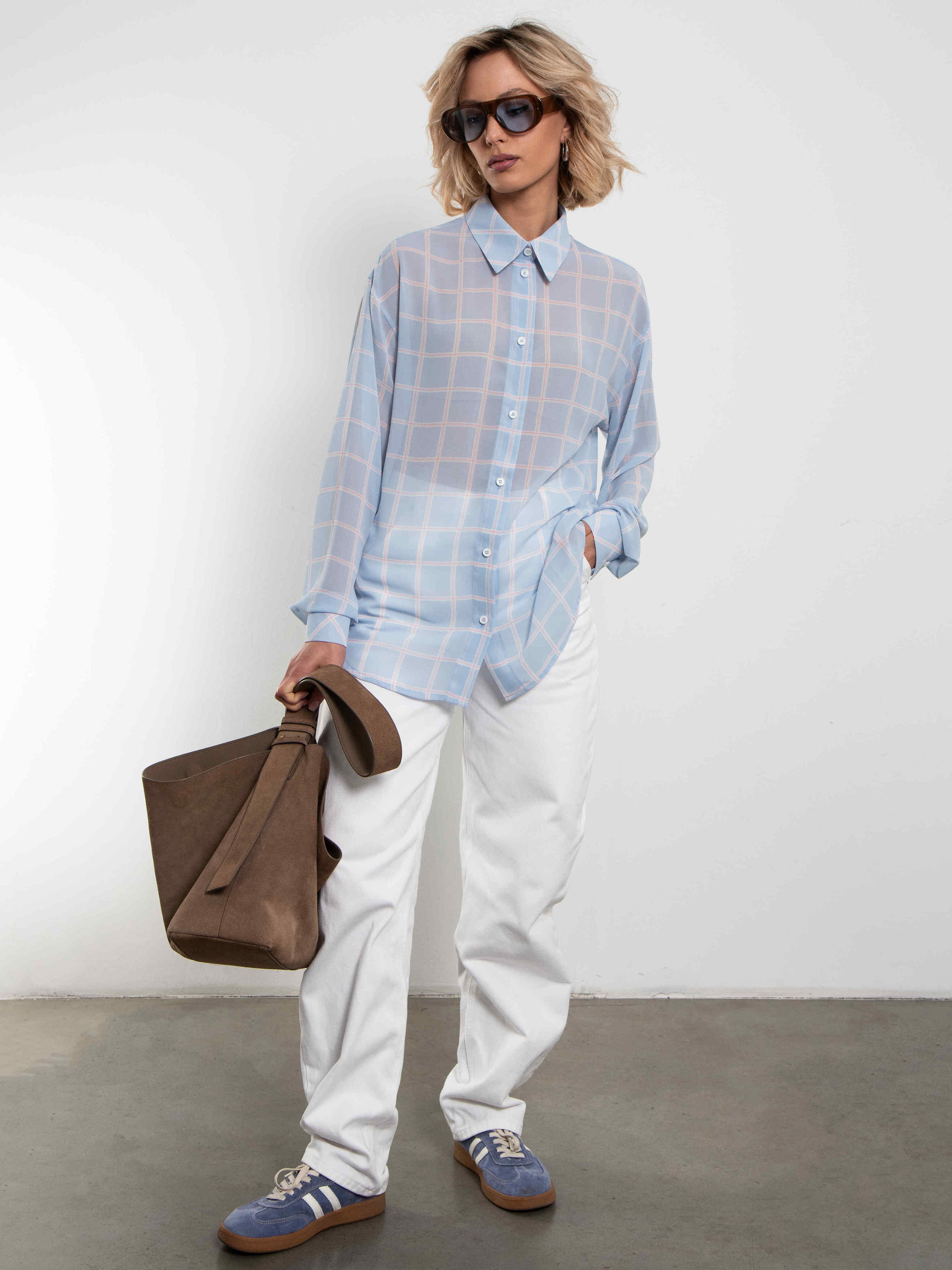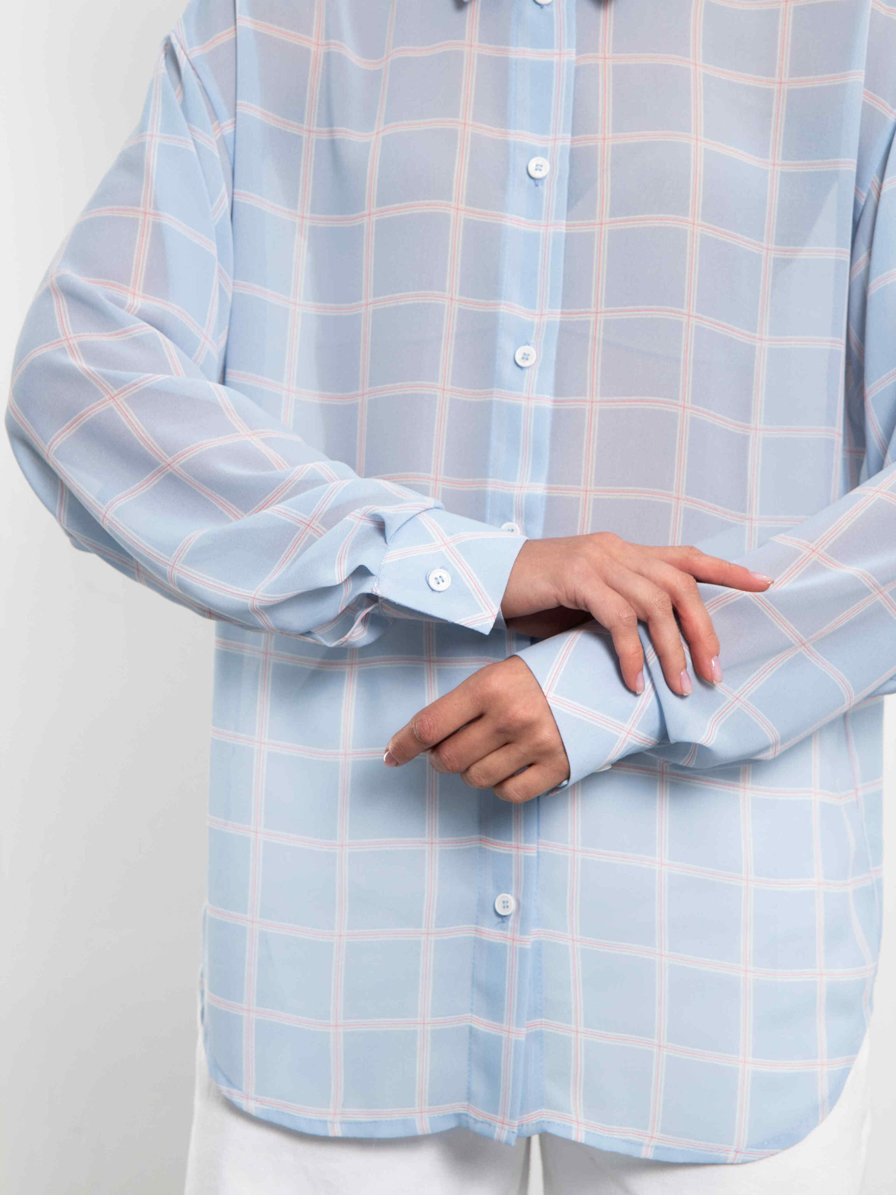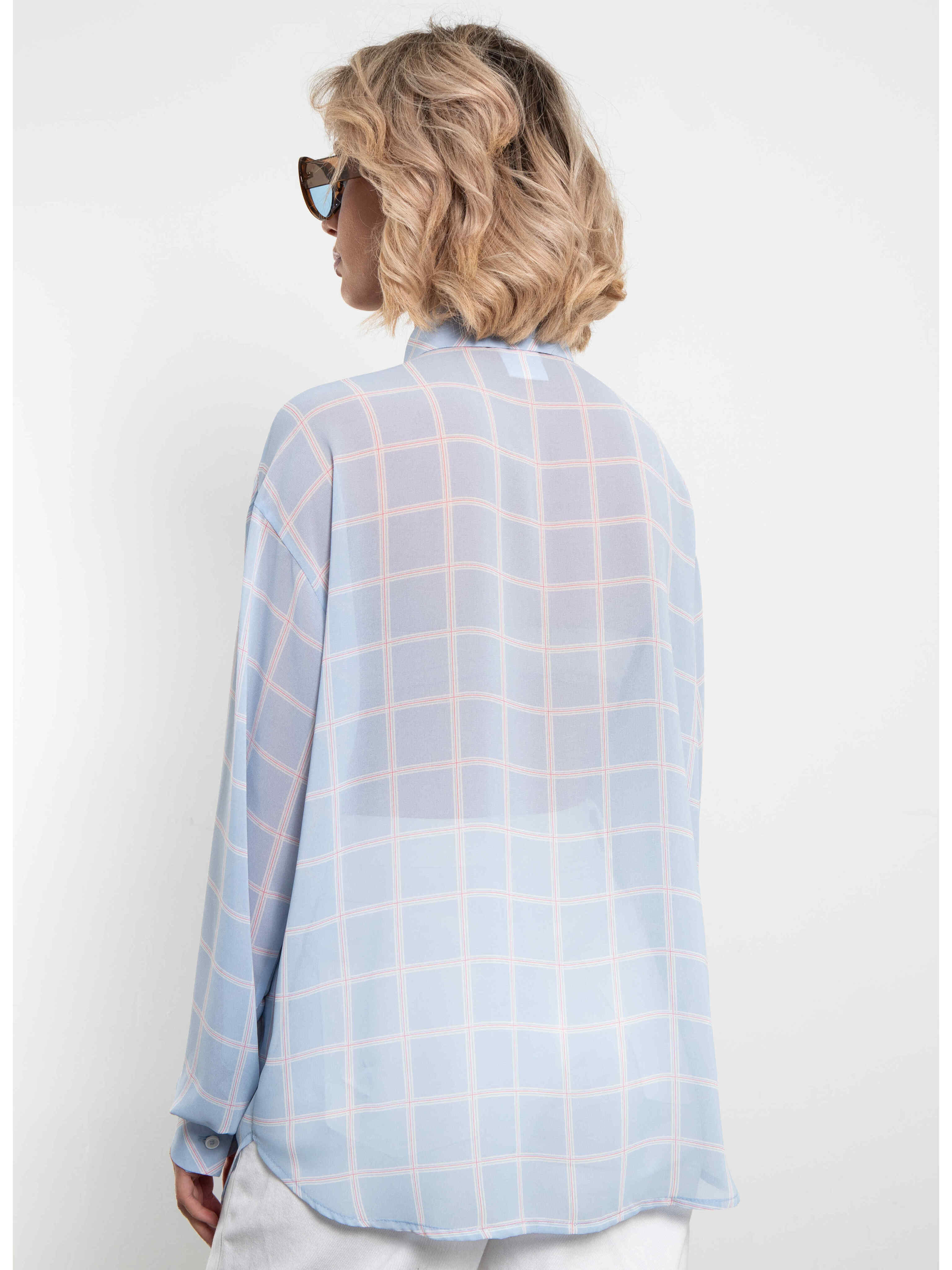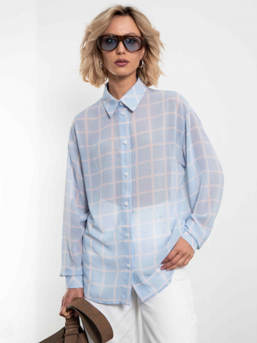 Оверсайз-крой с спущенными плечами, удлинёнными рукавами и классическим воротником на пуговицах — идеальный баланс расслабленной элегантности и современного шика. Цвет — нежный светло-голубой (или небесный) в бело-красную клетку — освежает образ и прекрасно смотрится как соло, так и в многослойных луках с топом или тонким джемпером. Наденьте, завяжите узлом на талии или оставьте расстёгнутой — в любом случае выглядит дорого, легко и очень актуально.