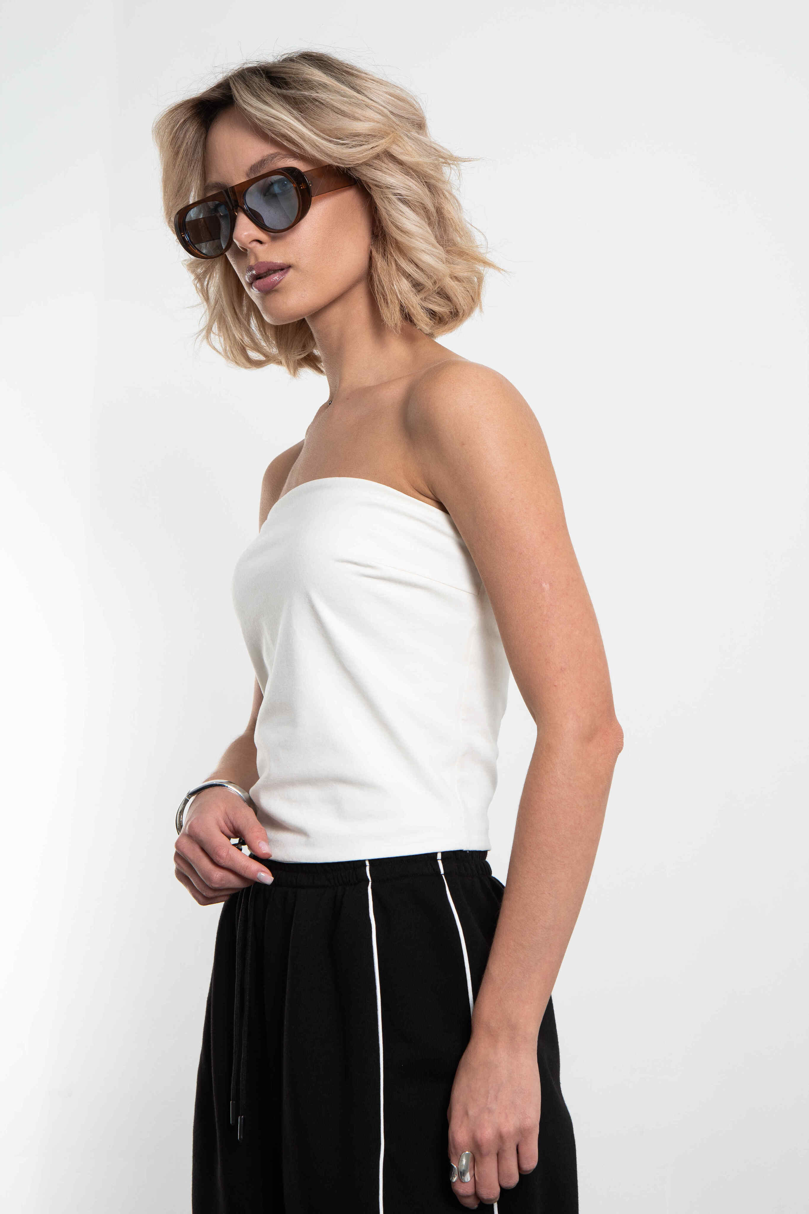 Этот топ-бандо — настоящая находка для тех, кто ценит лаконичность и женственность. Мягкая, эластичная и плотная не просвечивающаяся ткань нежно облегает фигуру, подчёркивая линию плеч и декольте, но при этом держит форму идеально — ничего не сползает и не жмёт. Без бретелек, без лишних деталей: чистый минимализм, который выглядит дорого и актуально.