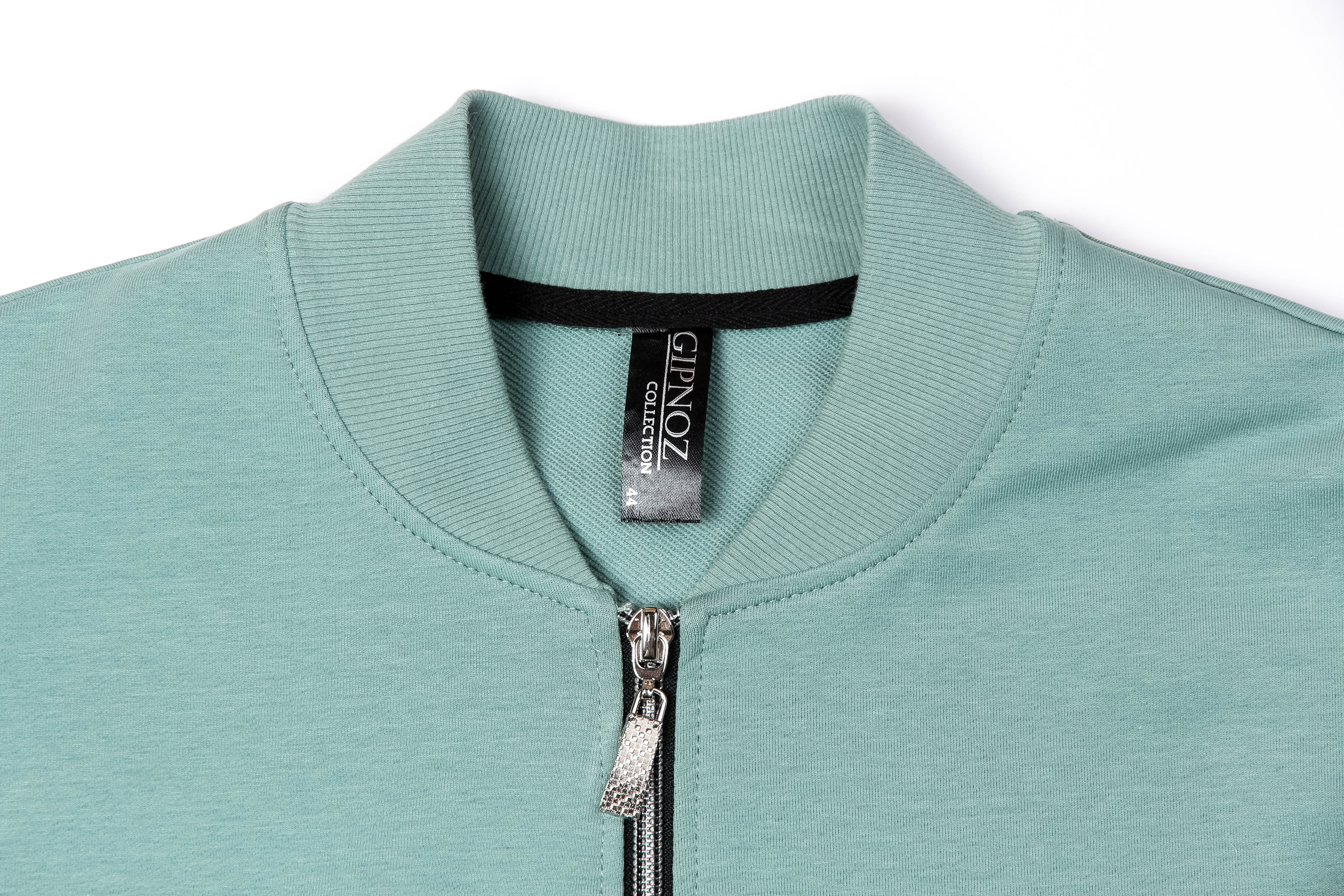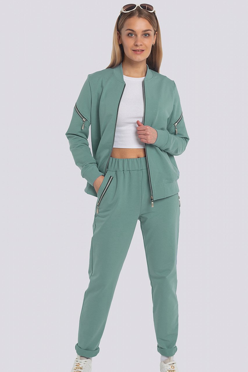 зеленая мята Брючный костюм из трикотажного полотна – идеальный вариант для повседневной носки!!! Удобство, мягкость, актуальные расцветки – мы постарались учесть все пожелания. Бомбер является лидером последних модных сезонов, может быть использован, как самостоятельная единица гардероба. Модель украшена молниями – дерзкий акцент, низ брюк подвернут, что позволит легко отрегулировать длину на любой рост. Состав трикотажа: 75% хлопок, 20% полиэстер, 5% спандекс.