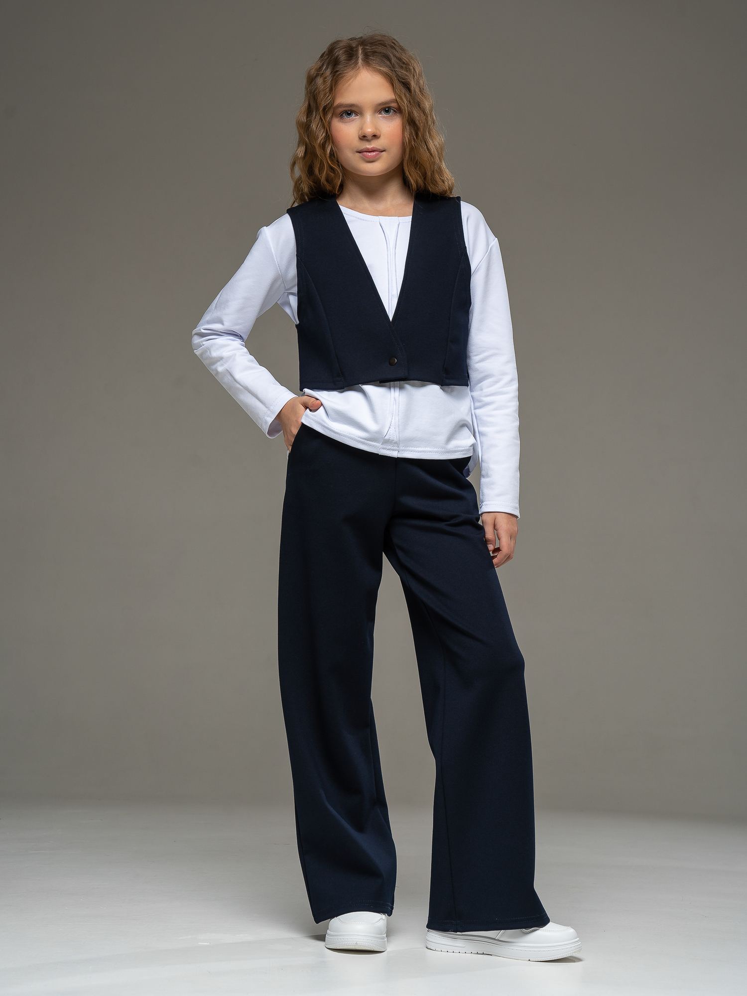 Школьный трикотажный костюм из джерси темно-синего цвета для девочки от бренда Looklie — стильное и удобное решение для школы, праздников и повседневной носки. Современный костюм для девочки состоит из укороченного жилета и модных брюк- палаццо, которые создают аккуратный и элегантный образ. Жилет школьный укороченный без воротника, С V-образной горловиной выполнен из мягкого и износостойкого материала джерси, отлично держит форму и не сковывает движения. Удобная застежка на кнопку позволяет легко надевать и снимать жилет, что особенно важно для школьников. Брюки палаццо для девочки прямого силуэта визуально вытягивают рост и обеспечивают максимальный комфорт в течение всего дня. Практичные боковые карманы добавляют функциональности, а эластичный трикотаж приятен к телу и не мнется. Этот школьный костюм для девочки идеально подходит как школьная форма, для торжественных мероприятий, фотосессий и повседневной носки. Добавьте в гардероб модный и практичный костюм школьный для девочки, который подчеркнет индивидуальность и обеспечит комфорт на весь учебный день.