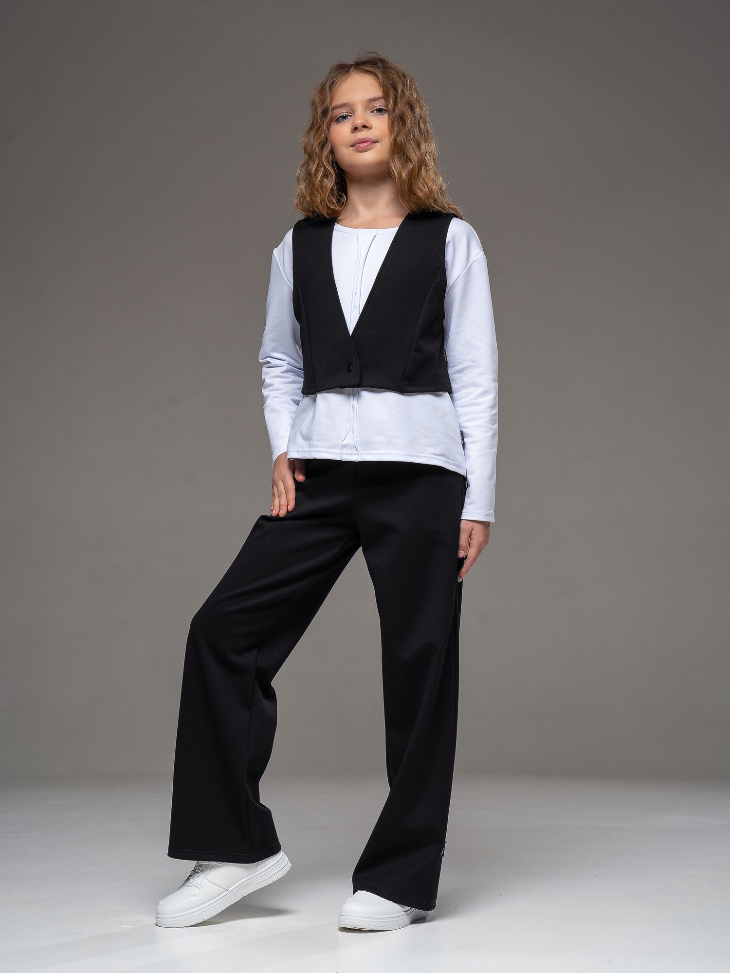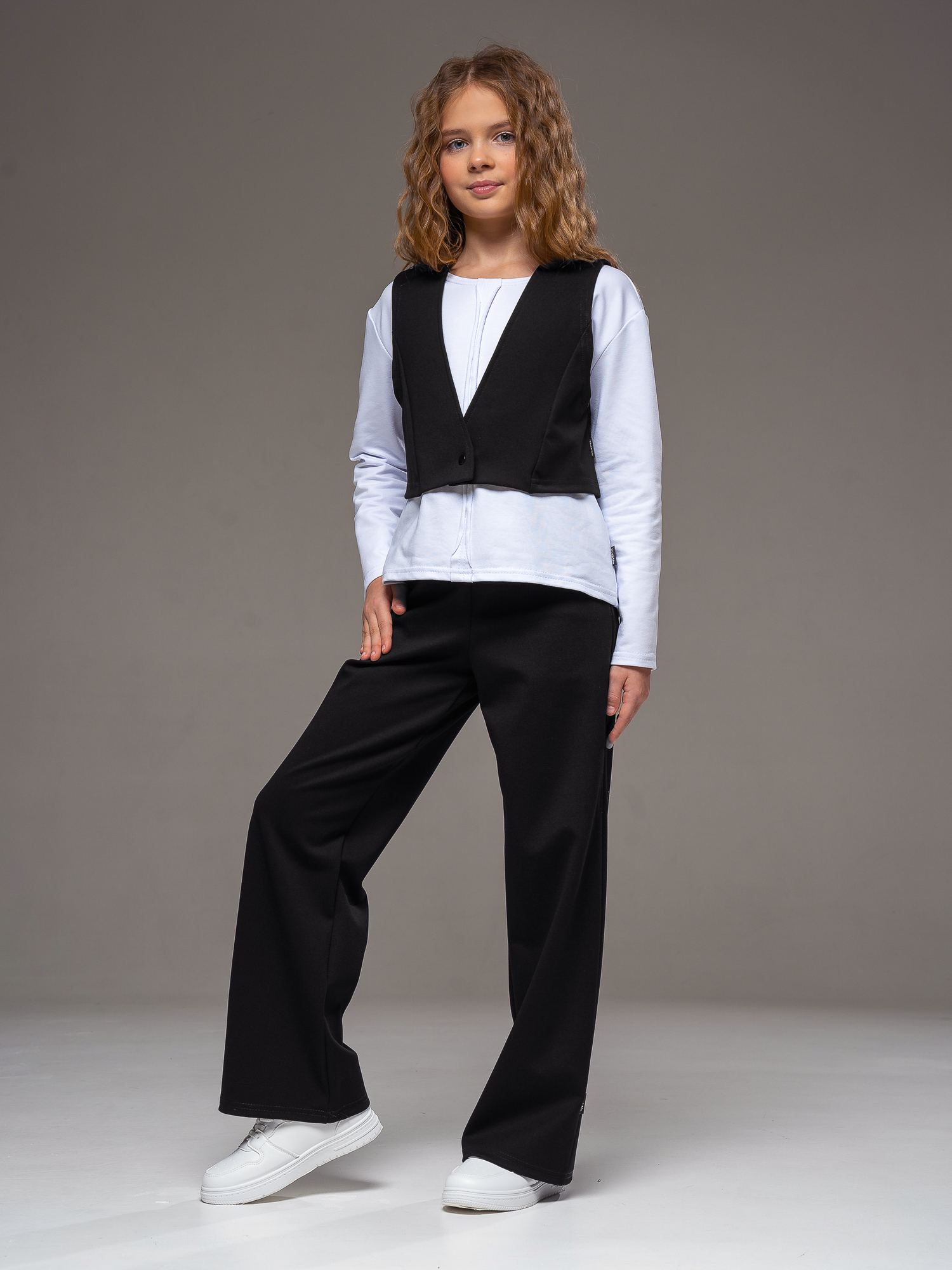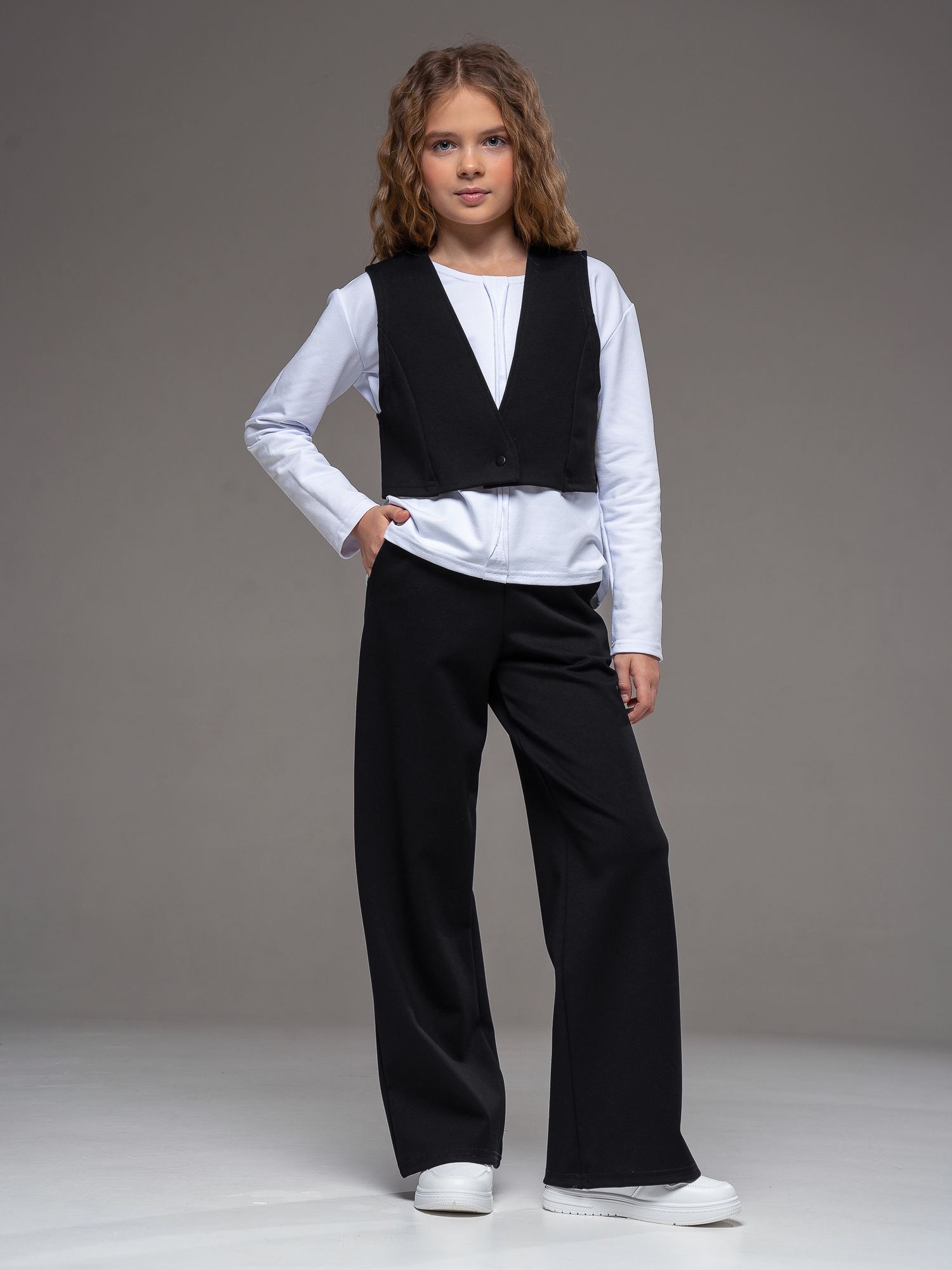 Школьный трикотажный костюм из джерси черного цвета для девочки от бренда Looklie — стильное и удобное решение для школы, праздников и повседневной носки. Современный костюм для девочки состоит из укороченного жилета и модных брюк- палаццо, которые создают аккуратный и элегантный образ. Жилет школьный укороченный без воротника, С V-образной горловиной выполнен из мягкого и износостойкого материала джерси, отлично держит форму и не сковывает движения. Удобная застежка на кнопку позволяет легко надевать и снимать жилет, что особенно важно для школьников. Брюки палаццо для девочки прямого силуэта визуально вытягивают рост и обеспечивают максимальный комфорт в течение всего дня. Практичные боковые карманы добавляют функциональности, а эластичный трикотаж приятен к телу и не мнется. Этот школьный костюм для девочки идеально подходит как школьная форма, для торжественных мероприятий, фотосессий и повседневной носки. Добавьте в гардероб модный и практичный костюм школьный для девочки, который подчеркнет индивидуальность и обеспечит комфорт на весь учебный день.