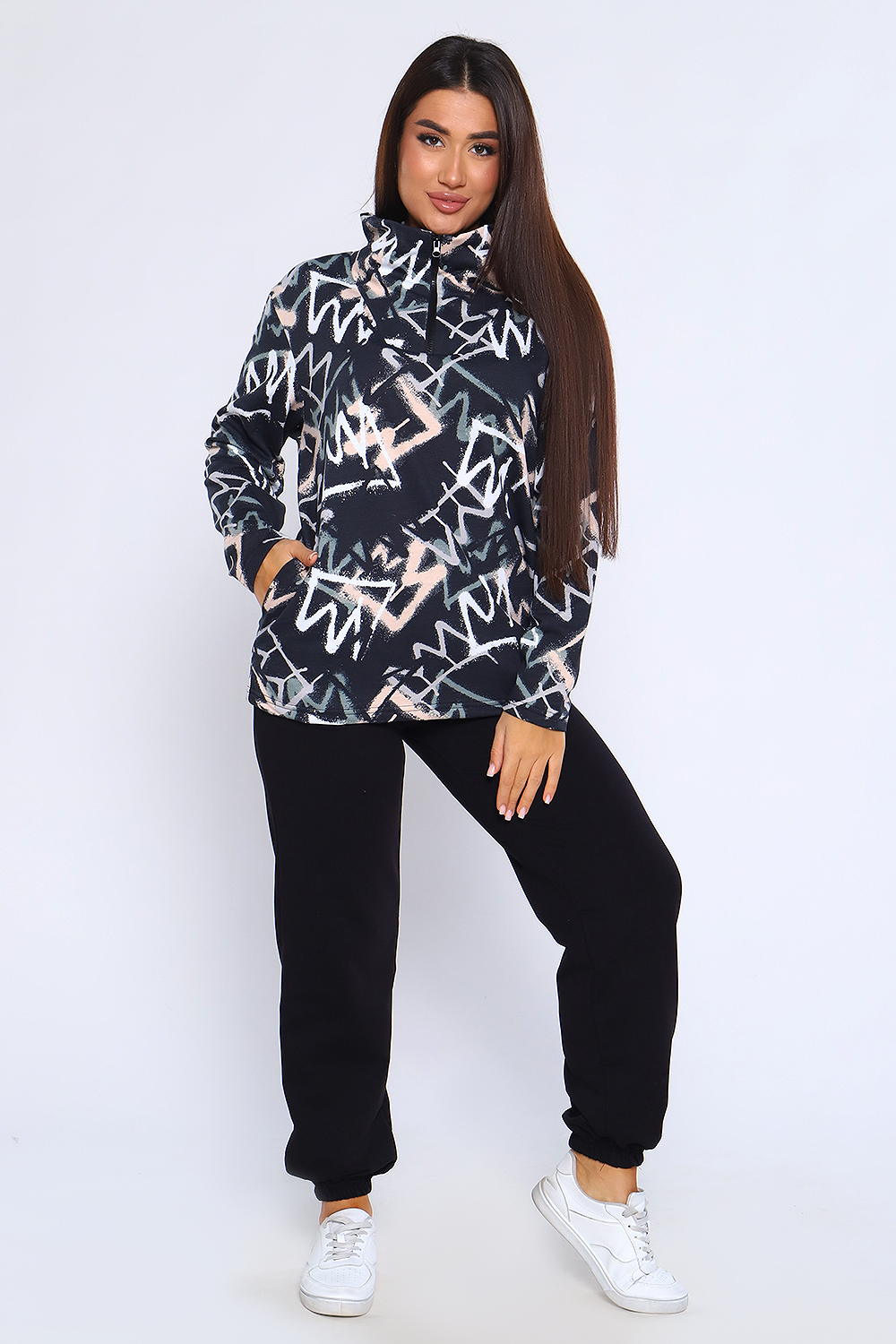 Спортивный костюм женский для любителей комфорта. Удобные брюки с высокой посадкой, низ брюк на резинке, два боковых кармана. Кофта с воротником стойкой на молнии. Стильный костюм с брюками отличный вариант для тренировок, утренних пробежек, прогулок, поездки на природу, на дачу, в путешествие.