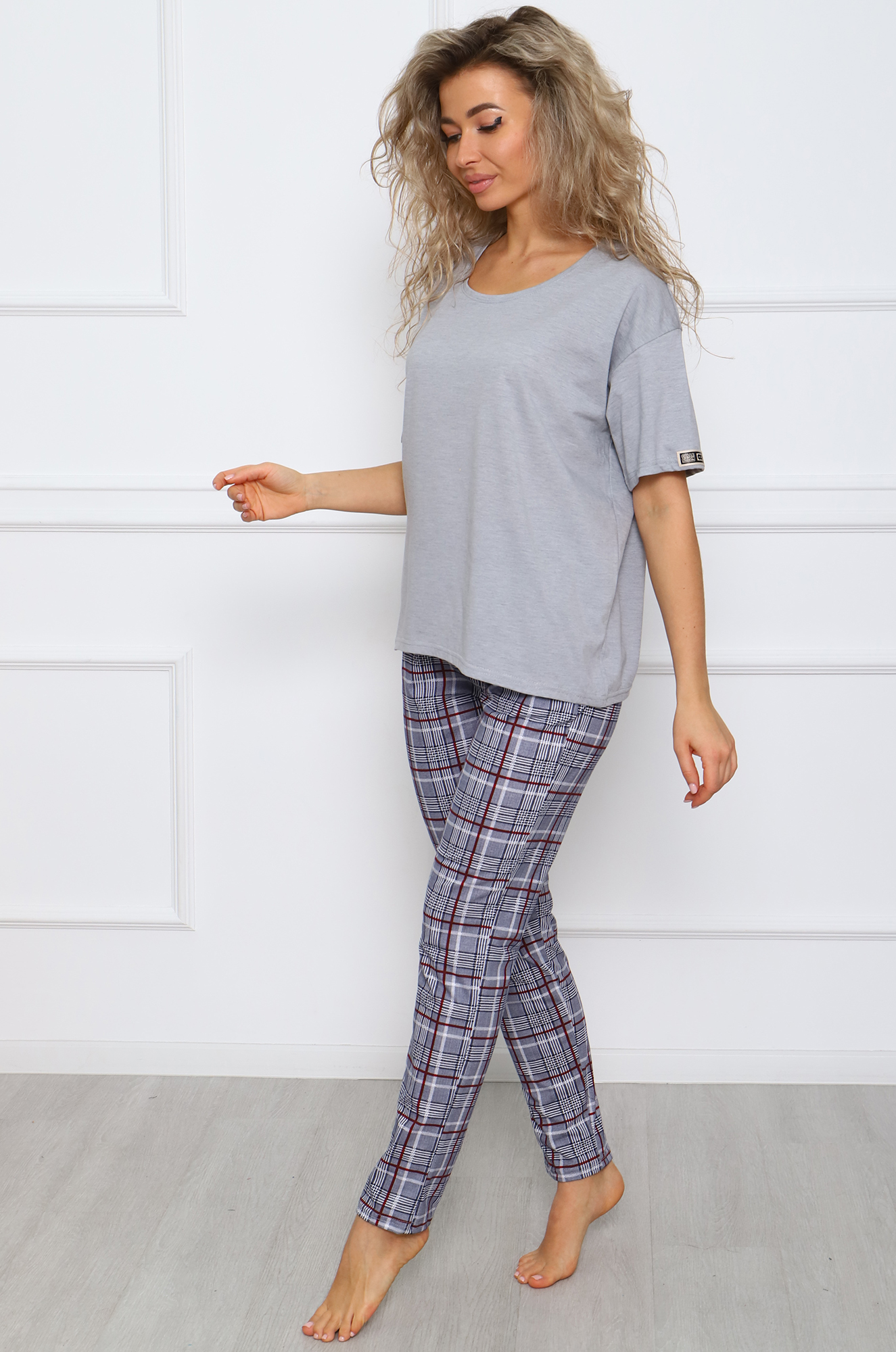 Симпатичный хлопковый костюм для дома и отдыха. Футболка в стиле оверсайз, модный удлинённый рукав, спущенное плечо, на рукаве стильная нашивка. Модель брюк зауженная, с комфортной посадкой, и удобными боковыми карманами, пояс на широкой резинке.